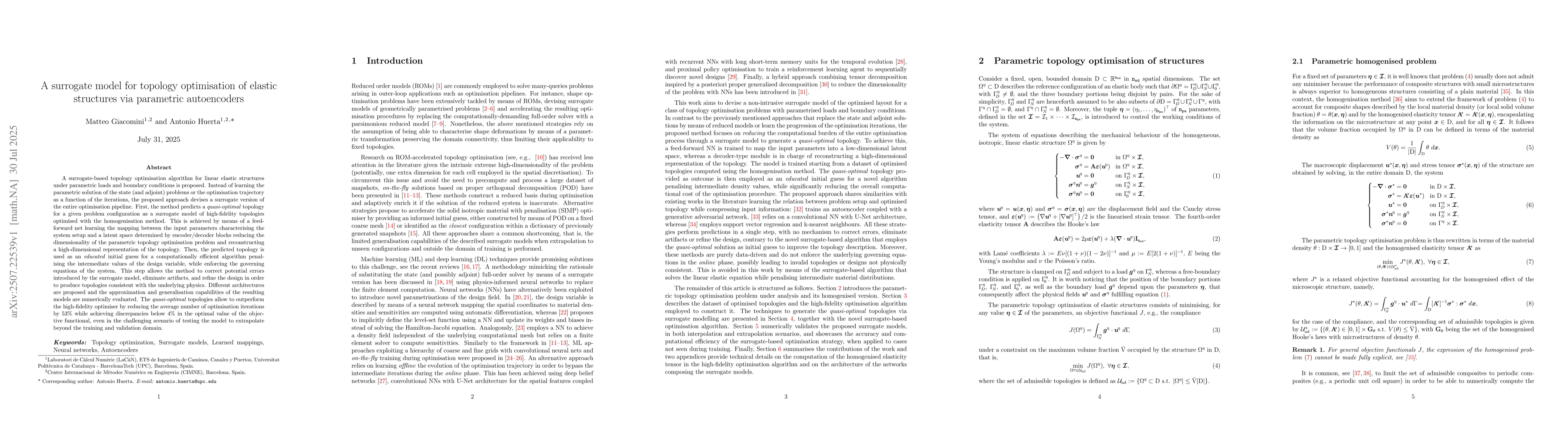 A surrogate-based topology optimisation algorithm for linear elastic structures under parametric loads and boundary conditions is proposed. Instead of learning the parametric solution of the state (and adjoint) problems or the optimisation trajectory as a function of the iterations, the proposed approach devises a surrogate version of the entire optimisation pipeline. First, the method predicts a quasi-optimal topology for a given problem configuration as a surrogate model of high-fidelity topologies optimised with the homogenisation method. This is achieved by means of a feed-forward net learning the mapping between the input parameters characterising the system setup and a latent space determined by encoder/decoder blocks reducing the dimensionality of the parametric topology optimisation problem and reconstructing a high-dimensional representation of the topology. Then, the predicted topology is used as an educated initial guess for a computationally efficient algorithm penalising the intermediate values of the design variable, while enforcing the governing equations of the system. This step allows the method to correct potential errors introduced by the surrogate model, eliminate artifacts, and refine the design in order to produce topologies consistent with the underlying physics. Different architectures are proposed and the approximation and generalisation capabilities of the resulting models are numerically evaluated. The quasi-optimal topologies allow to outperform the high-fidelity optimiser by reducing the average number of optimisation iterations by $53\%$ while achieving discrepancies below $4\%$ in the optimal value of the objective functional, even in the challenging scenario of testing the model to extrapolate beyond the training and validation domain.