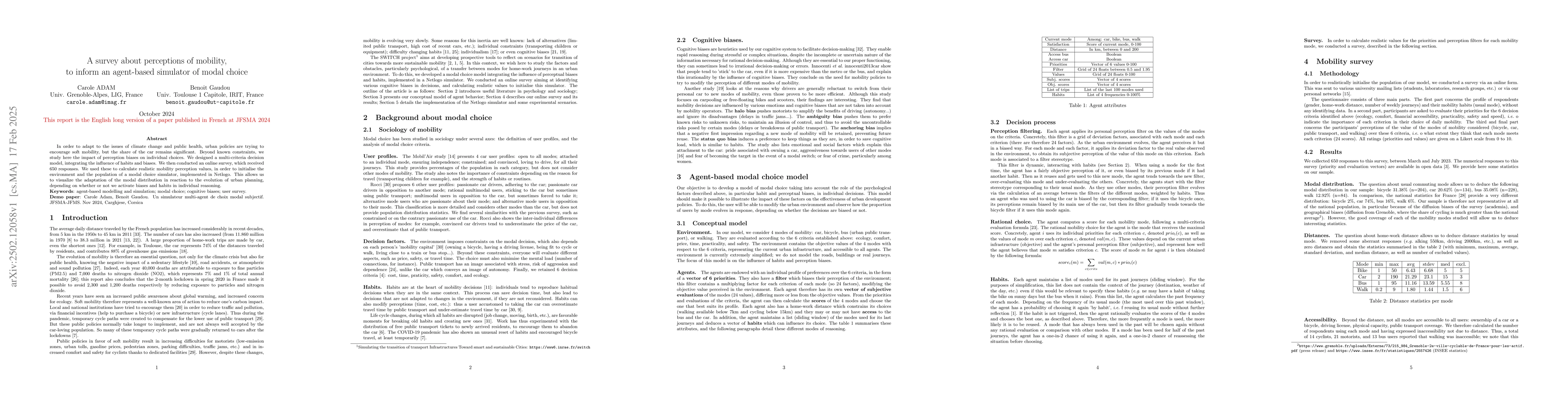 This study surveys perceptions of mobility to inform an agent-based simulator for subjective modal choice, focusing on how perception biases and habits influence individual transportation decisions. The survey results, from 650 respondents, are used to initialize a Netlogo simulator, visualizing how urban planning changes impact modal distribution.