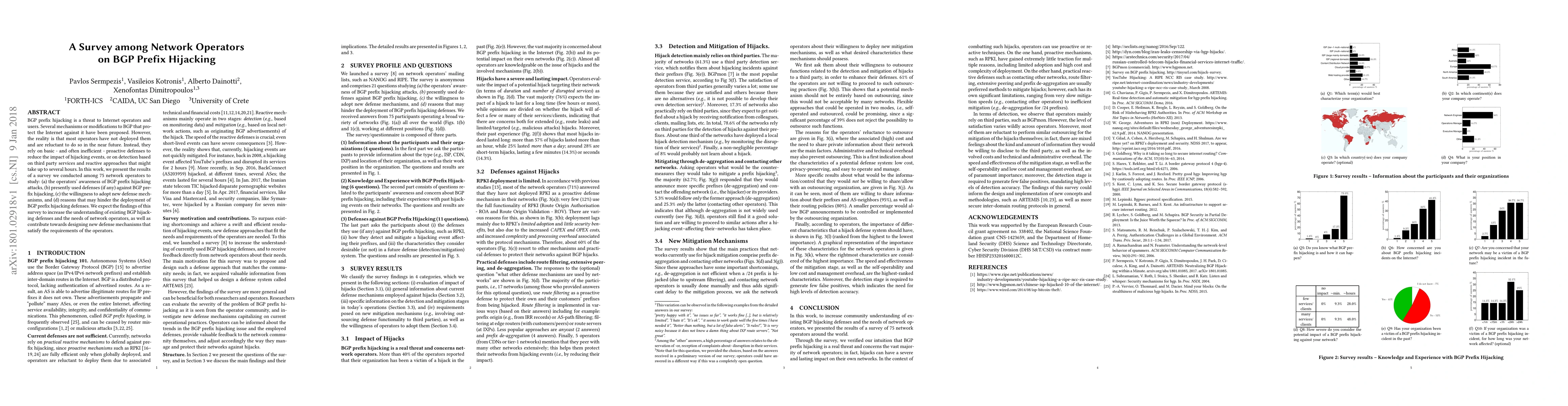 A survey was conducted among 75 network operators from various types of organizations and positions worldwide, using a questionnaire divided into three parts: participant and organization information, knowledge and experience with BGP prefix hijacking, and defenses against BGP prefix hijacking.
