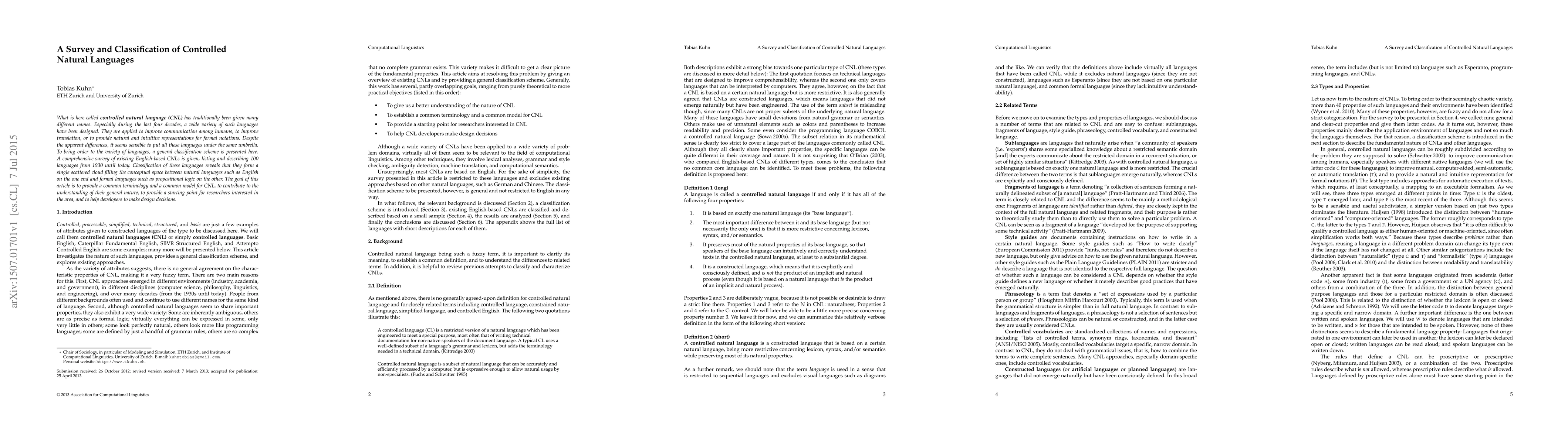 This paper surveys and classifies controlled natural languages (CNLs), presenting a comprehensive overview of 100 English-based CNLs from 1930 to today. It aims to unify terminology and provide a model for understanding CNLs, bridging natural and formal languages to aid researchers and developers.