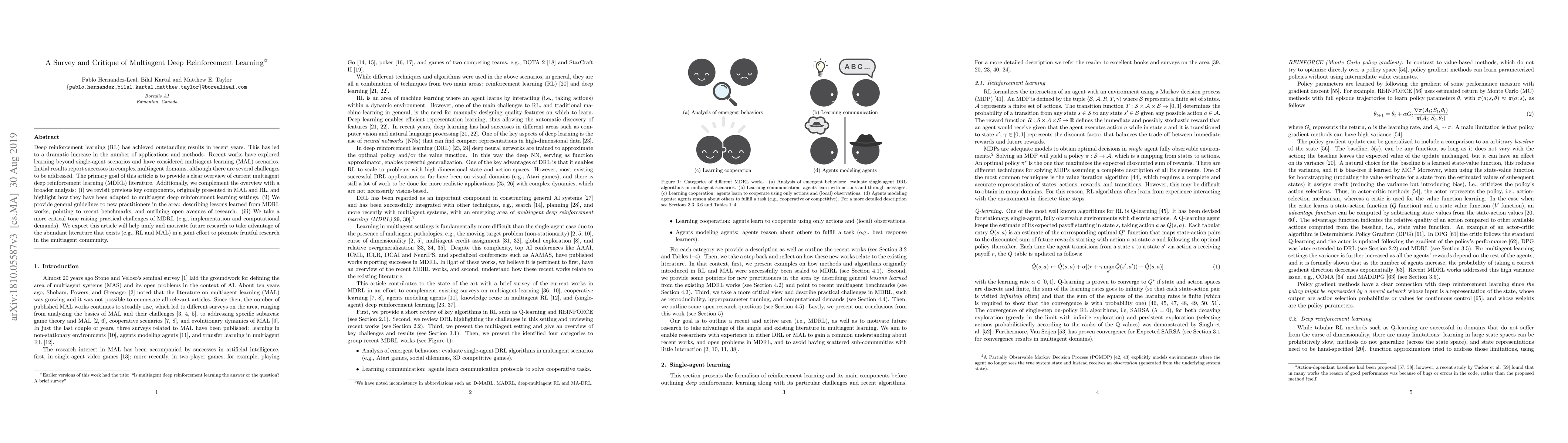 Deep reinforcement learning (RL) has achieved outstanding results in recent years. This has led to a dramatic increase in the number of applications and methods. Recent works have explored learning beyond single-agent scenarios and have considered multiagent learning (MAL) scenarios. Initial results report successes in complex multiagent domains, although there are several challenges to be addressed. The primary goal of this article is to provide a clear overview of current multiagent deep reinforcement learning (MDRL) literature. Additionally, we complement the overview with a broader analysis: (i) we revisit previous key components, originally presented in MAL and RL, and highlight how they have been adapted to multiagent deep reinforcement learning settings. (ii) We provide general guidelines to new practitioners in the area: describing lessons learned from MDRL works, pointing to recent benchmarks, and outlining open avenues of research. (iii) We take a more critical tone raising practical challenges of MDRL (e.g., implementation and computational demands). We expect this article will help unify and motivate future research to take advantage of the abundant literature that exists (e.g., RL and MAL) in a joint effort to promote fruitful research in the multiagent community.