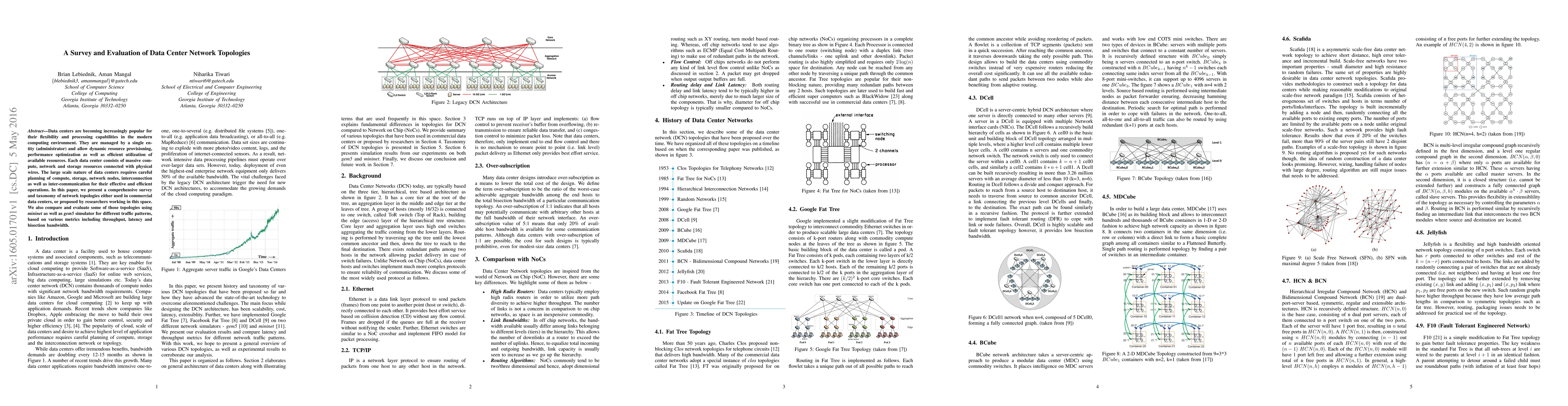 This paper surveys and categorizes various network topologies used in commercial data centers and proposed by researchers. It evaluates these topologies using simulation tools for metrics like throughput, latency, and bisection bandwidth to assess their performance under different traffic patterns.