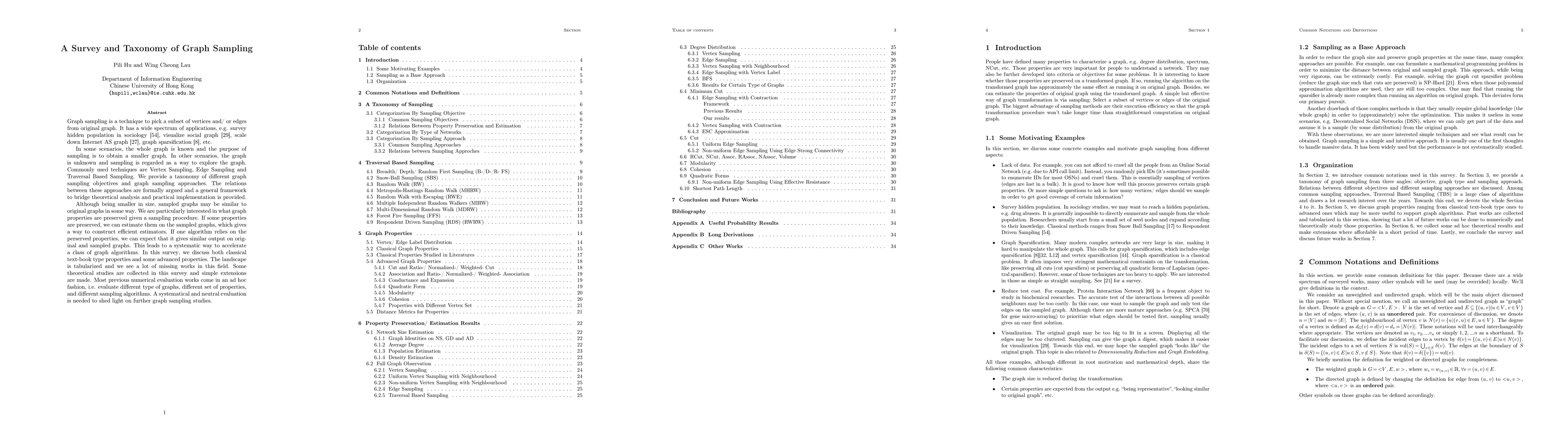 Graph sampling is a technique to pick a subset of vertices and/ or edges from original graph. It has a wide spectrum of applications, e.g. survey hidden population in sociology [54], visualize social graph [29], scale down Internet AS graph [27], graph sparsification [8], etc. In some scenarios, the whole graph is known and the purpose of sampling is to obtain a smaller graph. In other scenarios, the graph is unknown and sampling is regarded as a way to explore the graph. Commonly used techniques are Vertex Sampling, Edge Sampling and Traversal Based Sampling. We provide a taxonomy of different graph sampling objectives and graph sampling approaches. The relations between these approaches are formally argued and a general framework to bridge theoretical analysis and practical implementation is provided. Although being smaller in size, sampled graphs may be similar to original graphs in some way. We are particularly interested in what graph properties are preserved given a sampling procedure. If some properties are preserved, we can estimate them on the sampled graphs, which gives a way to construct efficient estimators. If one algorithm relies on the perserved properties, we can expect that it gives similar output on original and sampled graphs. This leads to a systematic way to accelerate a class of graph algorithms. In this survey, we discuss both classical text-book type properties and some advanced properties. The landscape is tabularized and we see a lot of missing works in this field. Some theoretical studies are collected in this survey and simple extensions are made. Most previous numerical evaluation works come in an ad hoc fashion, i.e. evaluate different type of graphs, different set of properties, and different sampling algorithms. A systematical and neutral evaluation is needed to shed light on further graph sampling studies.