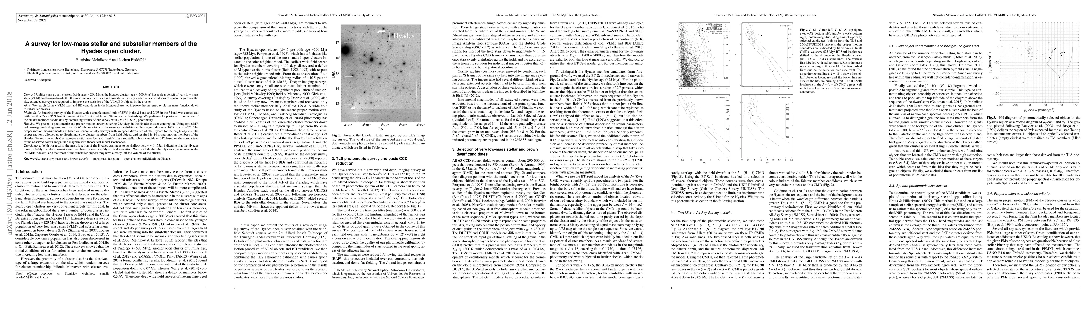 Unlike young open clusters (with ages <250 Myr), the Hyades cluster (age ~600 Myr) has a clear deficit of very low-mass stars (VLM) and brown dwarfs (BD). Since this open cluster has a low stellar density and covers several tens of square degrees on the sky, extended surveys are required to improve the statistics of the VLM/BD objects in the cluster. We search for new VLM stars and BD candidates in the Hyades to improve the present-day cluster mass function down to substellar masses. An imaging survey of the Hyades with a completeness limit of 21m.5 in the $R$ band and 20m.5 in the $I$ band was carried out with the 2kx2k CCD Schmidt camera at the 2m Alfred Jensch Telescope in Tautenburg. We performed a photometric selection of the cluster member candidates by combining results of our survey with 2MASS JHKs photometry. We present a photometric and proper motion survey covering 23.4 deg$^2$ in the Hyades cluster core region. Using optical/IR colour-magnitude diagrams, we identify 66 photometric cluster member candidates in the magnitude range 14m.7
