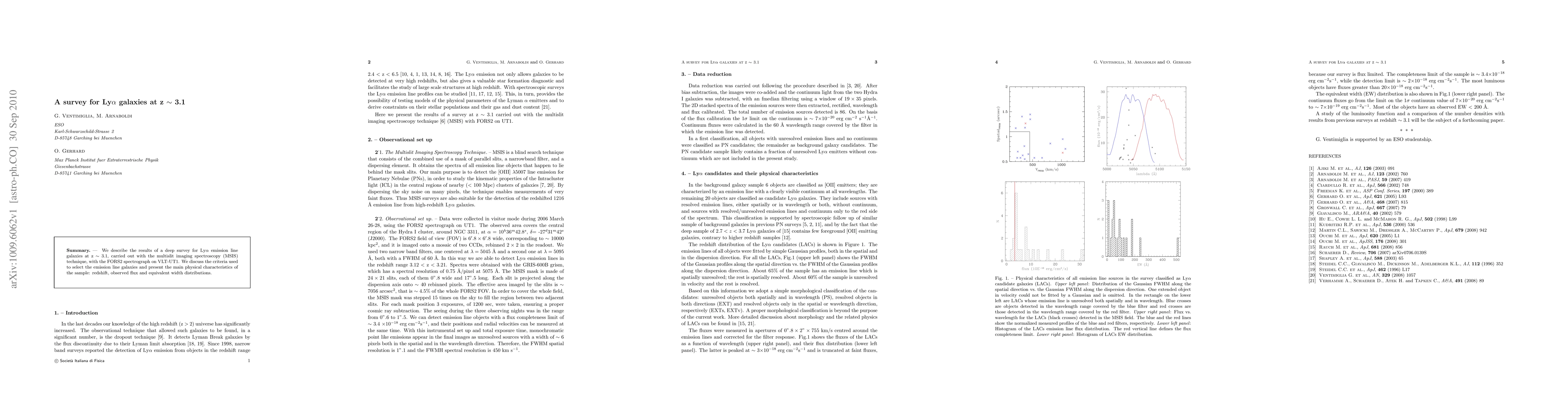 We describe the results of a deep survey for Ly alpha emission line galaxies at z~3.1, carried out with the multislit imaging spectroscopy (MSIS) technique, with the FORS2 spectrograph on VLT-UT1. We discuss the criteria used to select the emission line galaxies and present the main physical characteristics of the sample: redshift, observed flux and equivalent width distributions.