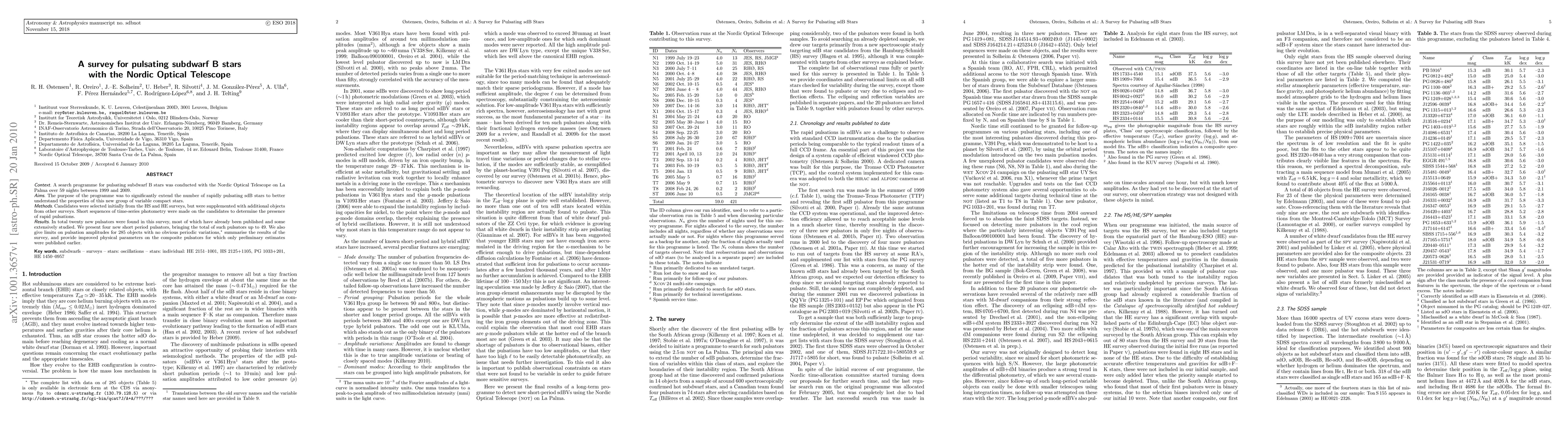 A 10-year survey of pulsating subdwarf B stars using the Nordic Optical Telescope found 20 new pulsators, bringing the total to 49, and provided improved physical parameters for composite pulsators.