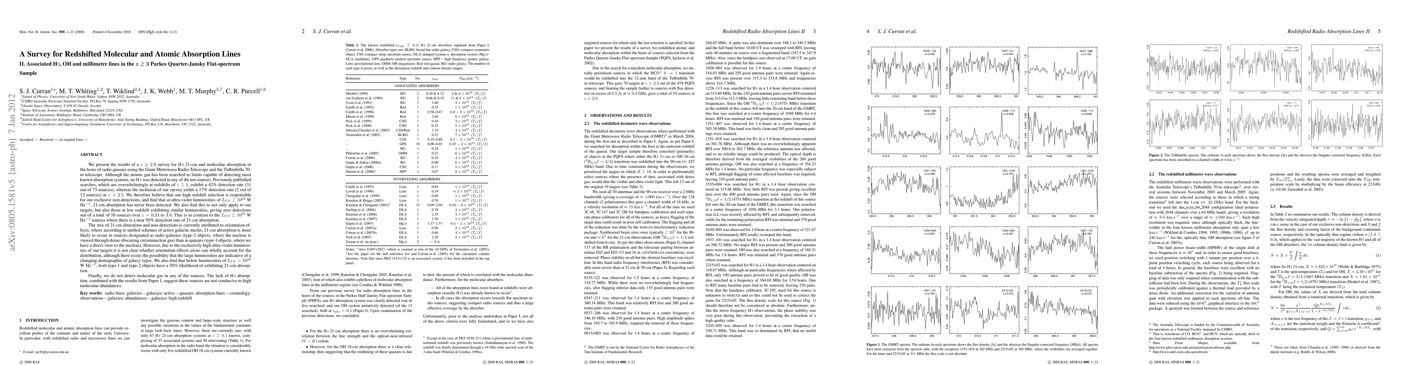 This study surveyed for redshifted HI, OH, and millimetre lines in high-redshift (z>2.5) radio quasars using GMRT and Tidbinbilla 70-m telescope, finding no 21-cm absorption in ultra-violet luminosities >10^23 W/Hz. The results suggest orientation effects might explain the disparity, but high luminosities could indicate a shift in galaxy types. Below ~10^23 W/Hz, both quasars and radio galaxies have equal chances of showing 21-cm absorption.
