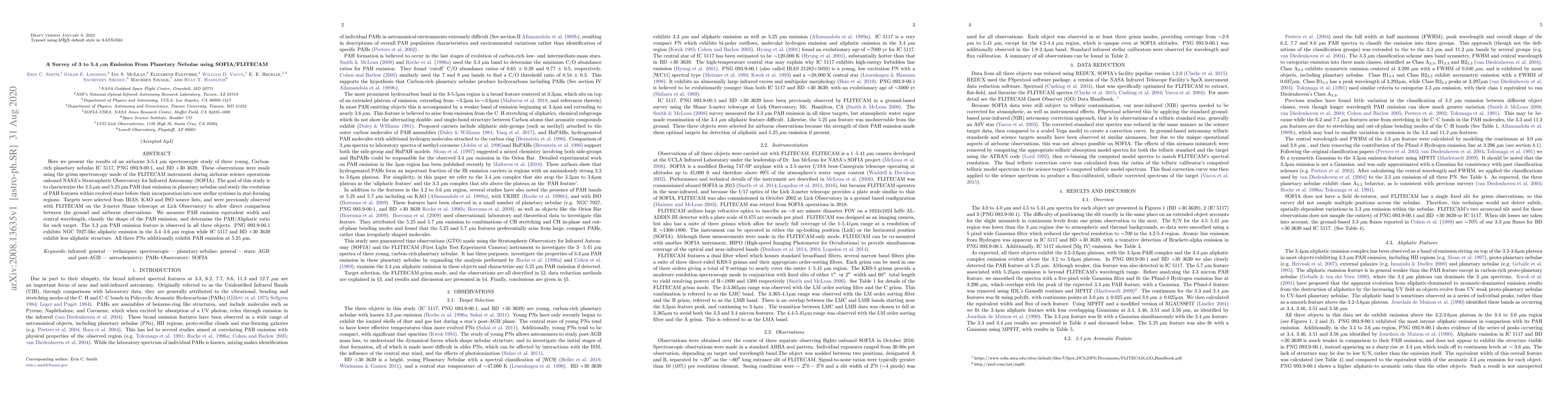 Here we present the results of an airborne 3-5.4$\mu$m spectroscopic study of three young, Carbon-rich planetary nebulae IC 5117, PNG 093.9-00.1, and BD $+$30 3639. These observations were made using the grism spectroscopy mode of the FLITECAM instrument during airborne science operations onboard NASA's Stratospheric Observatory for Infrared Astronomy (SOFIA). The goal of this study is to characterize the 3.3 $\mu$m and 5.25 $\mu$m PAH dust emission in planetary nebulae and study the evolution of PAH features within evolved stars before their incorporation into new stellar systems in star-forming regions. Targets were selected from IRAS, KAO and ISO source lists, and were previously observed with FLITECAM on the 3-meter Shane telescope at Lick Observatory to allow direct comparison between the ground and airborne observations. We measure PAH emission equivalent width and central wavelength, classify the shape of the PAH emission, and determine the PAH/Aliphatic ratio for each target. The 3.3 $\mu$m PAH emission feature is observed in all three objects. PNG 093.9-00.1 exhibits NGC 7027-like aliphatic emission in the 3.4 to 3.6 $\mu$m region while IC 5117 and BD +30 3639 exhibit less aliphatic structure. All three PNs additionally exhibit PAH emission at 5.25 $\mu$m.