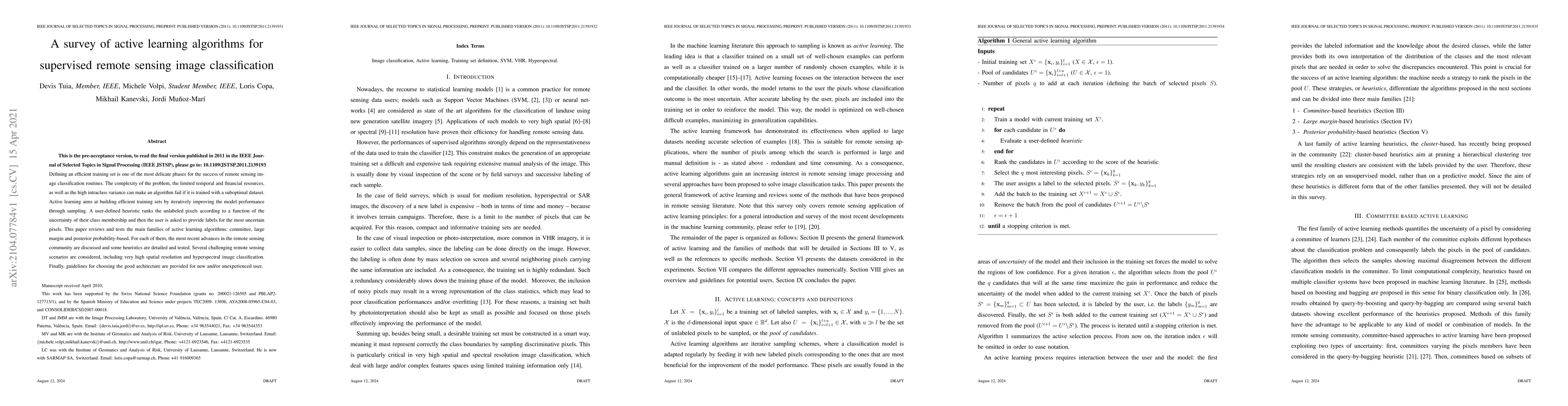 Defining an efficient training set is one of the most delicate phases for the success of remote sensing image classification routines. The complexity of the problem, the limited temporal and financial resources, as well as the high intraclass variance can make an algorithm fail if it is trained with a suboptimal dataset. Active learning aims at building efficient training sets by iteratively improving the model performance through sampling. A user-defined heuristic ranks the unlabeled pixels according to a function of the uncertainty of their class membership and then the user is asked to provide labels for the most uncertain pixels. This paper reviews and tests the main families of active learning algorithms: committee, large margin and posterior probability-based. For each of them, the most recent advances in the remote sensing community are discussed and some heuristics are detailed and tested. Several challenging remote sensing scenarios are considered, including very high spatial resolution and hyperspectral image classification. Finally, guidelines for choosing the good architecture are provided for new and/or unexperienced user.
