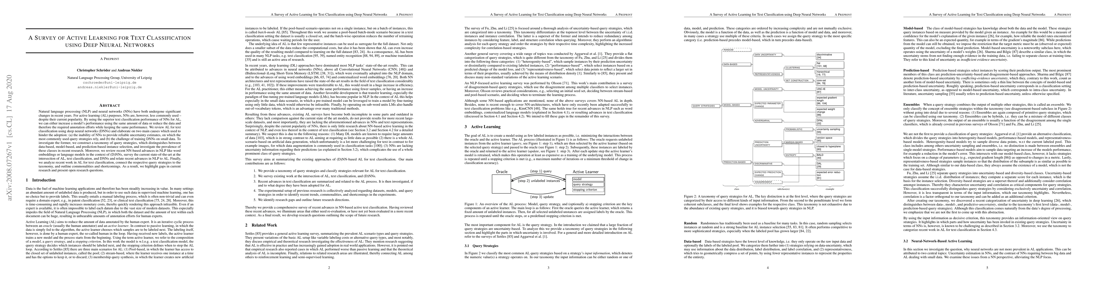 This paper surveys active learning for text classification using deep neural networks, addressing two main challenges: unreliable uncertainty estimates from NNs and difficulties training DNNs on small datasets. The study categorizes query strategies and reviews recent advances in NLP to identify gaps and open questions in current research.