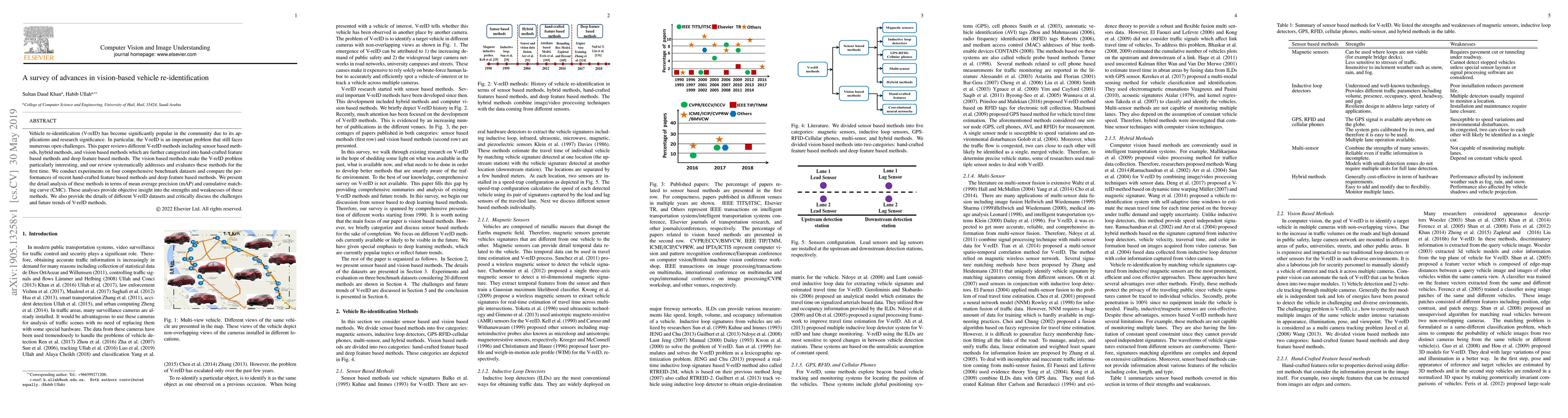 Vehicle re-identification (V-reID) has become significantly popular in the community due to its applications and research significance. In particular, the V-reID is an important problem that still faces numerous open challenges. This paper reviews different V-reID methods including sensor based methods, hybrid methods, and vision based methods which are further categorized into hand-crafted feature based methods and deep feature based methods. The vision based methods make the V-reID problem particularly interesting, and our review systematically addresses and evaluates these methods for the first time. We conduct experiments on four comprehensive benchmark datasets and compare the performances of recent hand-crafted feature based methods and deep feature based methods. We present the detail analysis of these methods in terms of mean average precision (mAP) and cumulative matching curve (CMC). These analyses provide objective insight into the strengths and weaknesses of these methods. We also provide the details of different V-reID datasets and critically discuss the challenges and future trends of V-reID methods.