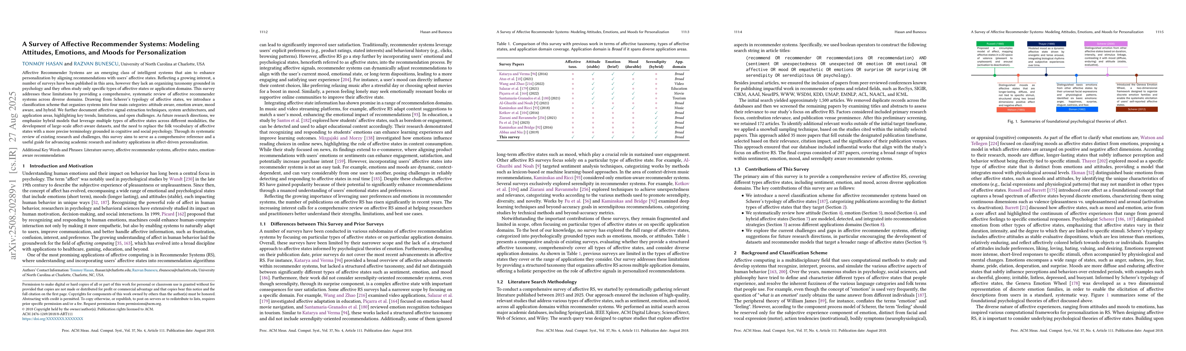 Affective Recommender Systems are an emerging class of intelligent systems that aim to enhance personalization by aligning recommendations with users' affective states. Reflecting a growing interest, a number of surveys have been published in this area, however they lack an organizing taxonomy grounded in psychology and they often study only specific types of affective states or application domains. This survey addresses these limitations by providing a comprehensive, systematic review of affective recommender systems across diverse domains. Drawing from Scherer's typology of affective states, we introduce a classification scheme that organizes systems into four main categories: attitude aware, emotion aware, mood aware, and hybrid. We further document affective signal extraction techniques, system architectures, and application areas, highlighting key trends, limitations, and open challenges. As future research directions, we emphasize hybrid models that leverage multiple types of affective states across different modalities, the development of large-scale affect-aware datasets, and the need to replace the folk vocabulary of affective states with a more precise terminology grounded in cognitive and social psychology. Through its systematic review of existing research and challenges, this survey aims to serve as a comprehensive reference and a useful guide for advancing academic research and industry applications in affect-driven personalization.
