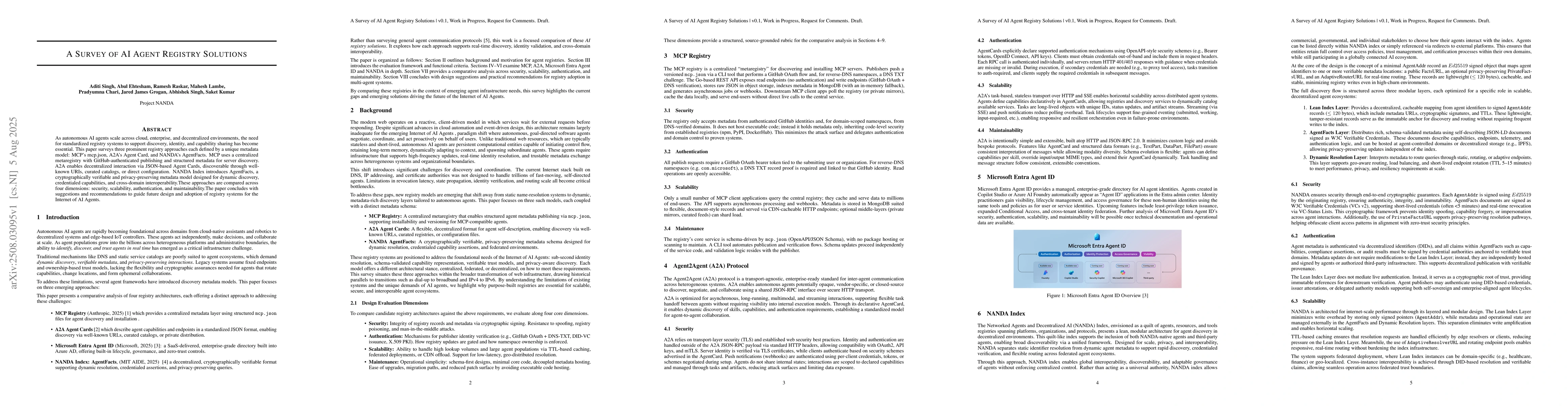As As autonomous AI agents scale across cloud, enterprise, and decentralized environments, the need for standardized registry systems to support discovery, identity, and capability sharing has become essential. This paper surveys three prominent registry approaches each defined by a unique metadata model: MCP's mcp.json, A2A's Agent Card, and NANDA's AgentFacts. MCP uses a centralized metaregistry with GitHub authenticated publishing and structured metadata for server discovery. A2A enables decentralized interaction via JSON-based Agent Cards, discoverable through well-known URIs, curated catalogs, or direct configuration. NANDA Index introduces AgentFacts, a cryptographically verifiable and privacy-preserving metadata model designed for dynamic discovery, credentialed capabilities, and cross-domain interoperability. These approaches are compared across four dimensions: security, scalability, authentication, and maintainability. The paper concludes with suggestions and recommendations to guide future design and adoption of registry systems for the Internet of AI Agents.
