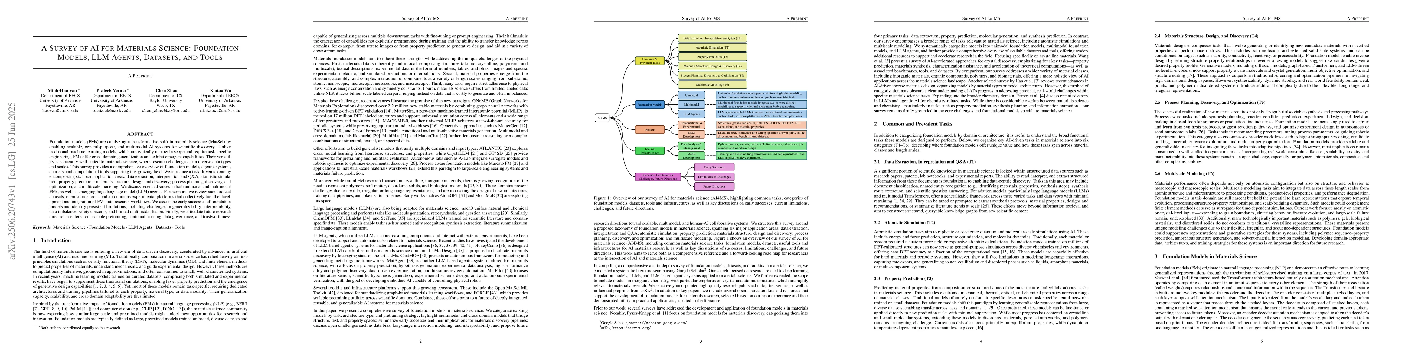 The paper provides a comprehensive survey of AI applications in materials science, focusing on foundation models, large language models (LLMs), datasets, and tools.