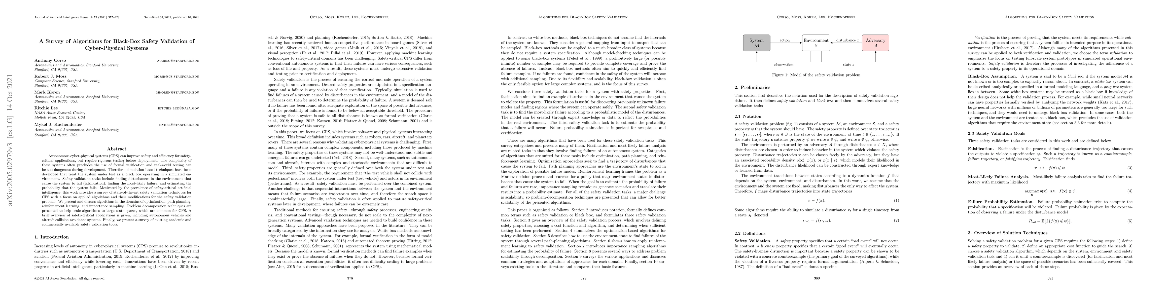 Autonomous cyber-physical systems (CPS) can improve safety and efficiency for safety-critical applications, but require rigorous testing before deployment. The complexity of these systems often precludes the use of formal verification and real-world testing can be too dangerous during development. Therefore, simulation-based techniques have been developed that treat the system under test as a black box operating in a simulated environment. Safety validation tasks include finding disturbances in the environment that cause the system to fail (falsification), finding the most-likely failure, and estimating the probability that the system fails. Motivated by the prevalence of safety-critical artificial intelligence, this work provides a survey of state-of-the-art safety validation techniques for CPS with a focus on applied algorithms and their modifications for the safety validation problem. We present and discuss algorithms in the domains of optimization, path planning, reinforcement learning, and importance sampling. Problem decomposition techniques are presented to help scale algorithms to large state spaces, which are common for CPS. A brief overview of safety-critical applications is given, including autonomous vehicles and aircraft collision avoidance systems. Finally, we present a survey of existing academic and commercially available safety validation tools.