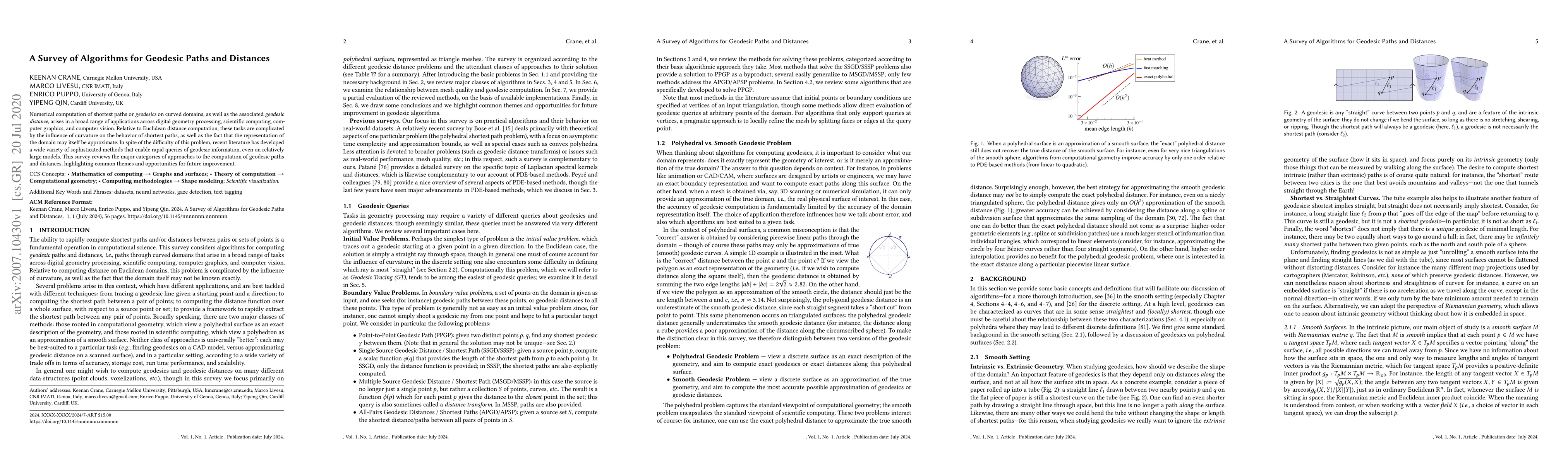 This paper surveys algorithms for computing geodesic paths and distances on curved domains, crucial in various fields like computer graphics and vision. It highlights major method categories, common themes, and areas for future advancements, emphasizing the complexity added by domain curvature and representation approximation.