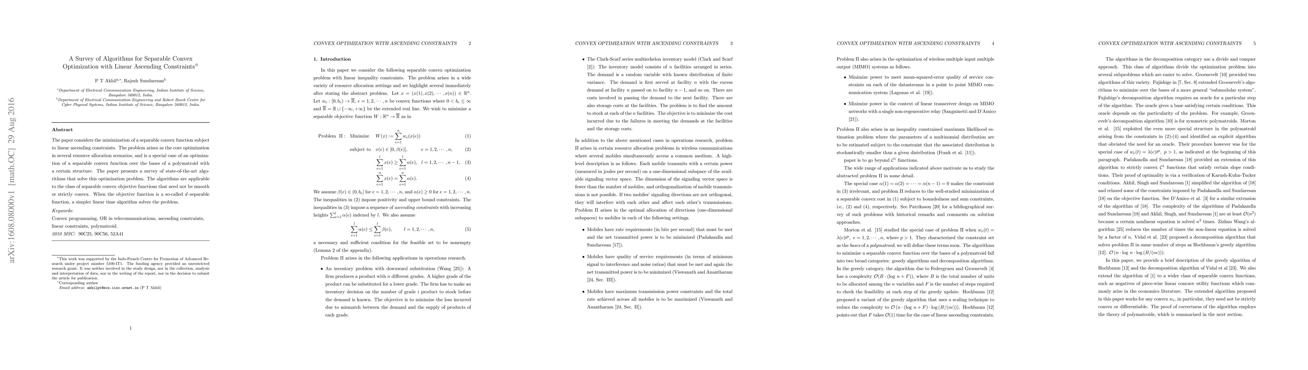 The paper considers the minimization of a separable convex function subject to linear ascending constraints. The problem arises as the core optimization in several resource allocation scenarios, and is a special case of an optimization of a separable convex function over the bases of a polymatroid with a certain structure. The paper presents a survey of state-of-the-art algorithms that solve this optimization problem. The algorithms are applicable to the class of separable convex objective functions that need not be smooth or strictly convex. When the objective function is a so-called $d$-separable function, a simpler linear time algorithm solves the problem.
