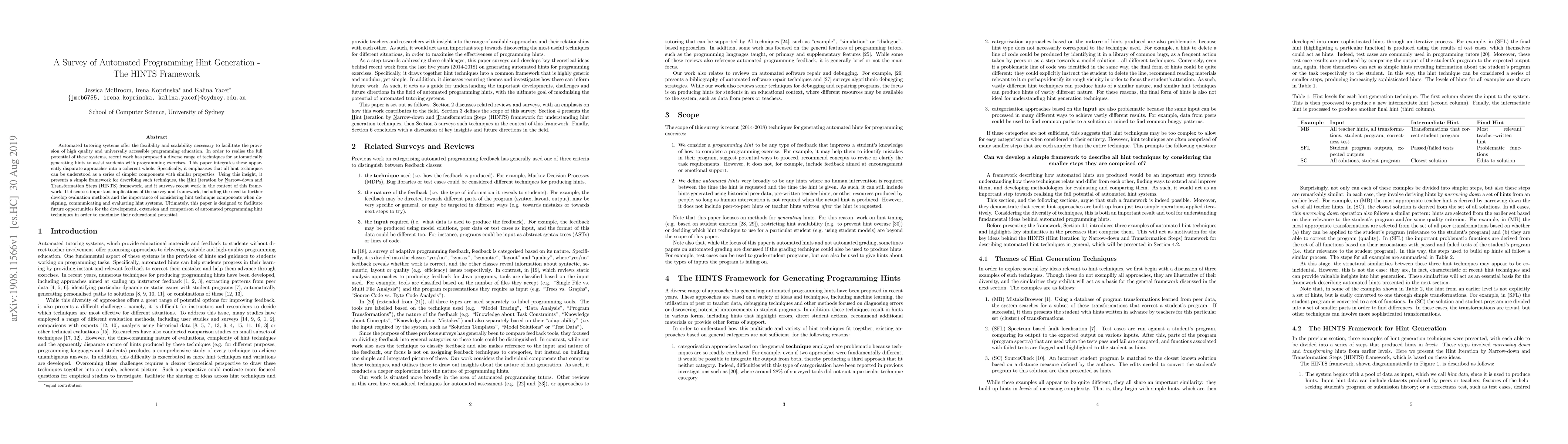 This paper surveys automated programming hint generation techniques, integrating them into the HINTS framework, which categorizes hints as iterative processes of narrowing and transformation. It emphasizes the need for improved evaluation methods and highlights the importance of considering hint components in system design and communication.
