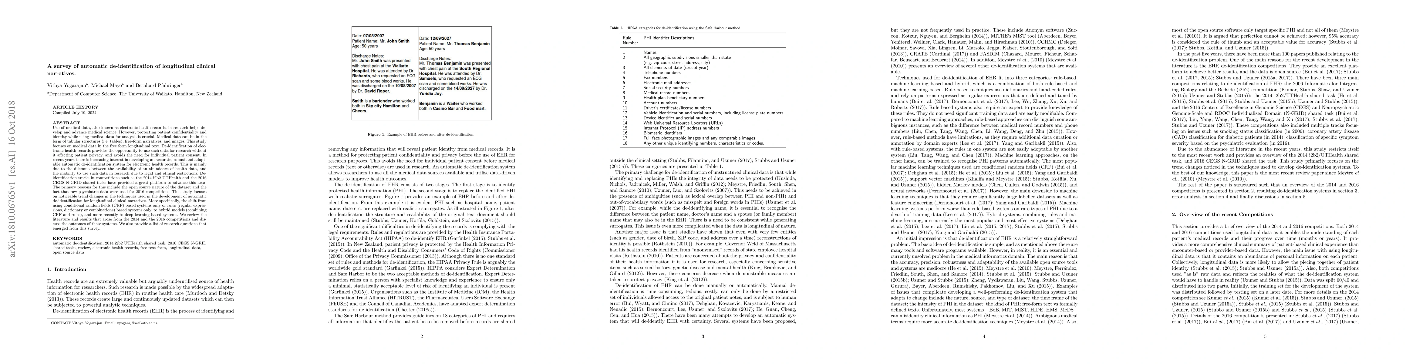Use of medical data, also known as electronic health records, in research helps develop and advance medical science. However, protecting patient confidentiality and identity while using medical data for analysis is crucial. Medical data can be in the form of tabular structures (i.e. tables), free-form narratives, and images. This study focuses on medical data in the free form longitudinal text. De-identification of electronic health records provides the opportunity to use such data for research without it affecting patient privacy, and avoids the need for individual patient consent. In recent years there is increasing interest in developing an accurate, robust and adaptable automatic de-identification system for electronic health records. This is mainly due to the dilemma between the availability of an abundance of health data, and the inability to use such data in research due to legal and ethical restrictions. De-identification tracks in competitions such as the 2014 i2b2 UTHealth and the 2016 CEGS N-GRID shared tasks have provided a great platform to advance this area. The primary reasons for this include the open source nature of the dataset and the fact that raw psychiatric data were used for 2016 competitions. This study focuses on noticeable trend changes in the techniques used in the development of automatic de-identification for longitudinal clinical narratives. More specifically, the shift from using conditional random fields (CRF) based systems only or rules (regular expressions, dictionary or combinations) based systems only, to hybrid models (combining CRF and rules), and more recently to deep learning based systems. We review the literature and results that arose from the 2014 and the 2016 competitions and discuss the outcomes of these systems. We also provide a list of research questions that emerged from this survey.