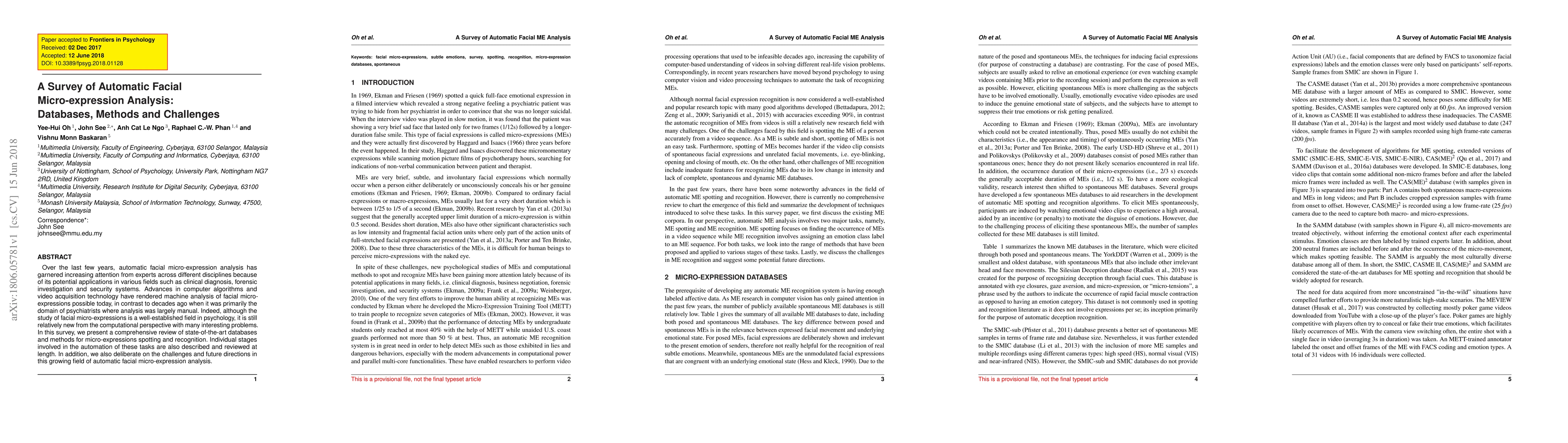 This paper provides a comprehensive review of current databases, methods, and challenges in automatic facial micro-expression analysis, highlighting its potential applications in clinical, forensic, and security fields, and discussing future research directions.