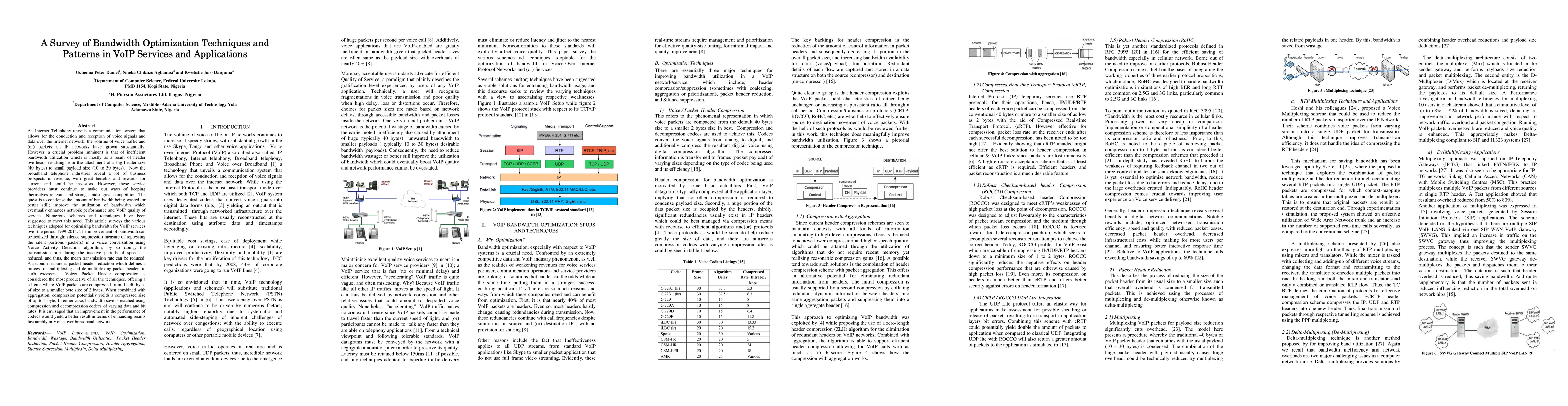 The paper surveys bandwidth optimization techniques for VoIP services from 1999-2014, highlighting Voice Activity Detection for silent portion reduction, packet header minimization, and Voice/Packet Header compression as the most effective methods. Combining compression with aggregation can reduce packet size to 1 byte, significantly saving bandwidth, with codec improvements expected to further enhance VoIP performance in broadband networks.