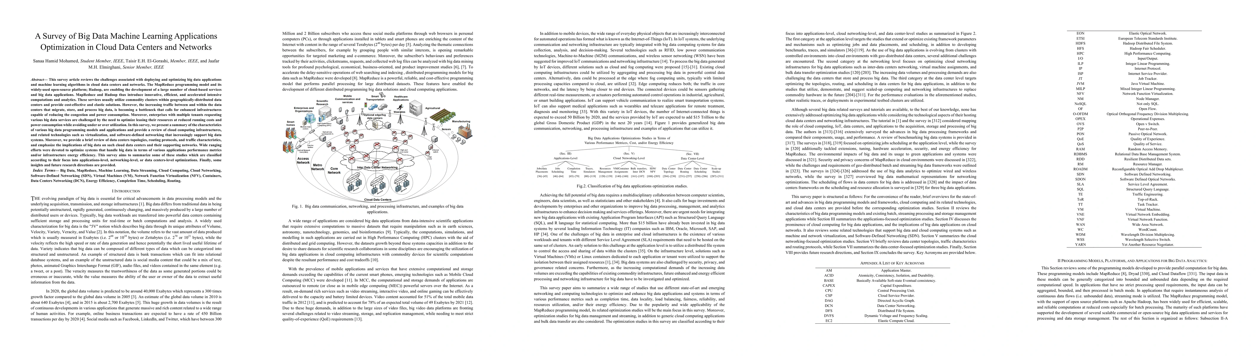 This survey reviews challenges in optimizing big data applications and machine learning in cloud data centers, emphasizing the role of Hadoop and MapReduce. It discusses infrastructure enhancements needed to reduce congestion and power consumption, and provides insights into resource optimization, data center topologies, and future research directions.
