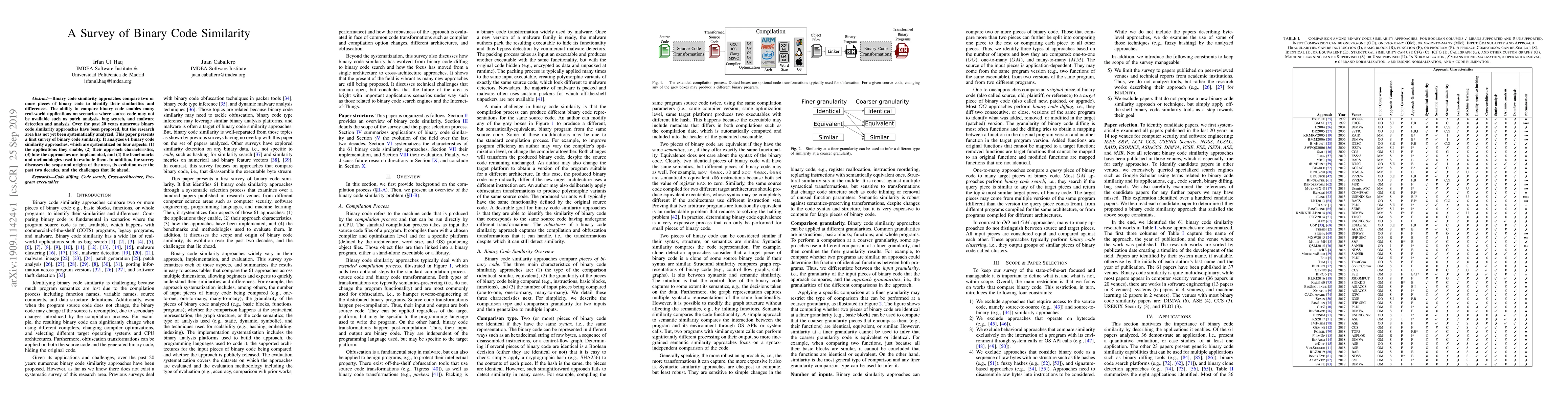 This paper surveys 61 binary code similarity approaches, categorizing them based on applications, characteristics, implementation, and evaluation methods. It highlights the evolution, challenges, and future directions in the field of binary code comparison for applications like patch analysis and malware detection.