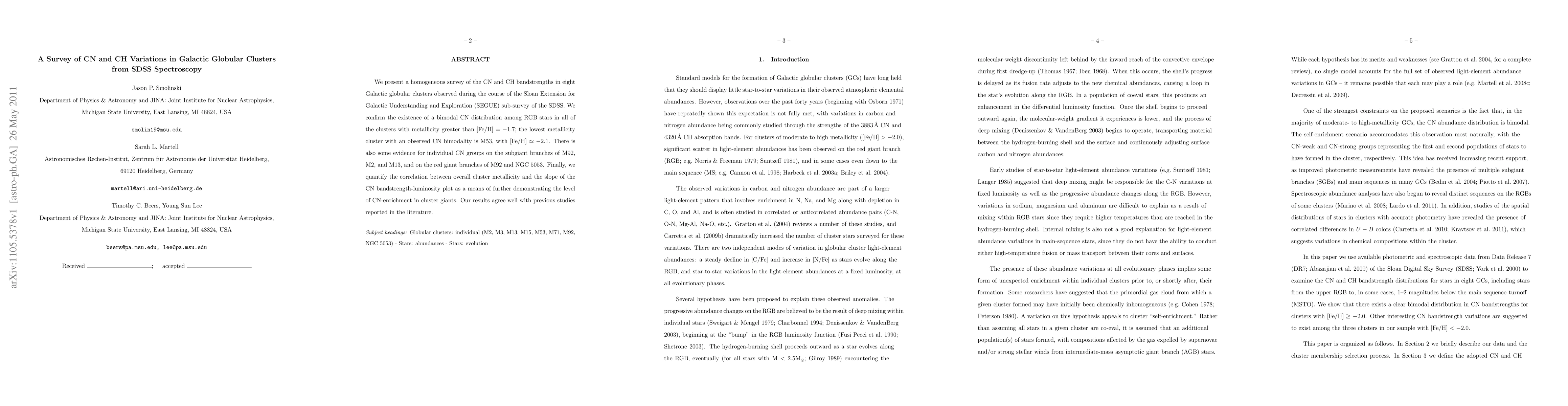 This study surveys CN and CH band strengths in eight Galactic globular clusters using SDSS data, confirming a bimodal CN distribution among red giant branch stars with metallicities above [Fe/H] = -1.7, and finding evidence for CN groups in subgiant and red giant branches in several clusters. The research also correlates cluster metallicity with CN bandstrength-luminosity plot slopes.