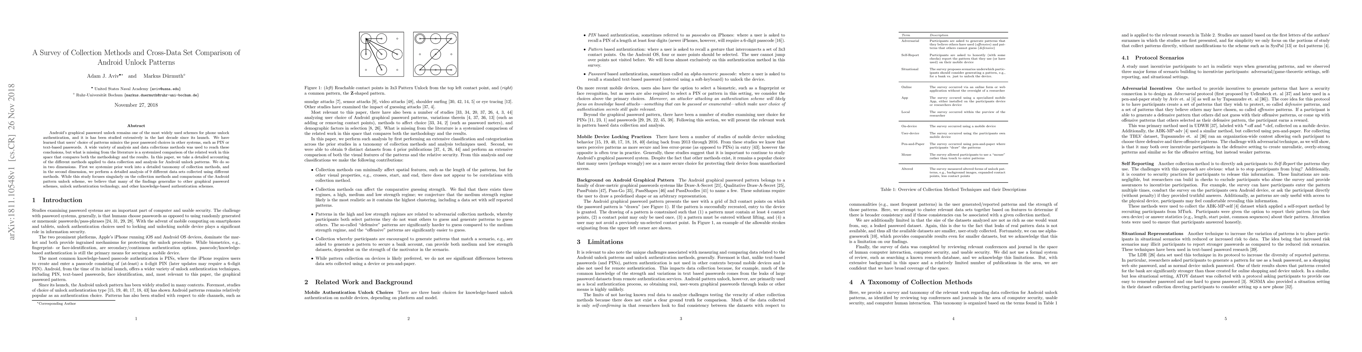 Android's graphical password unlock remains one of the most widely used schemes for phone unlock authentication, and it is has been studied extensively in the last decade since its launch. We have learned that users' choice of patterns mimics the poor password choices in other systems, such as PIN or text-based passwords. A wide variety of analysis and data collections methods was used to reach these conclusions, but what is missing from the literature is a systemized comparison of the related work in this space that compares both the methodology and the results. In this paper, we take a detailed accounting of the different methods applied to data collection and analysis for Android unlock patterns. We do so in two dimensions. First we systemize prior work into a detailed taxonomy of collection methods, and in the second dimension, we perform a detailed analysis of 9 different data sets collected using different methods. While this study focuses singularly on the collection methods and comparisons of the Android pattern unlock scheme, we believe that many of the findings generalize to other graphical password schemes, unlock authentication technology, and other knowledge-based authentication schemes.