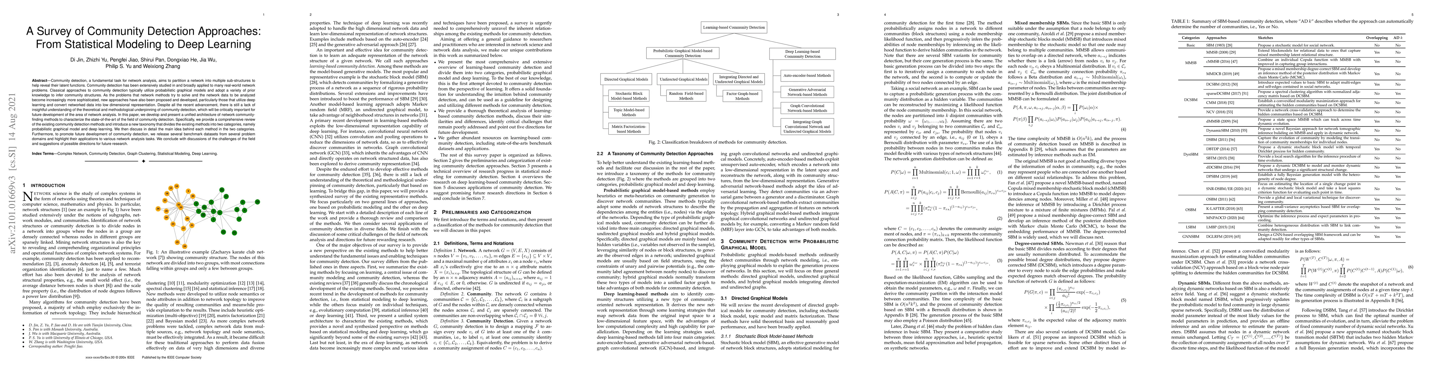 This paper provides a comprehensive review of community detection methods, categorizing them into probabilistic graphical models and deep learning approaches. It highlights the theoretical underpinnings and practical applications of these methods, releases benchmark datasets, and discusses future research directions to advance network analysis.