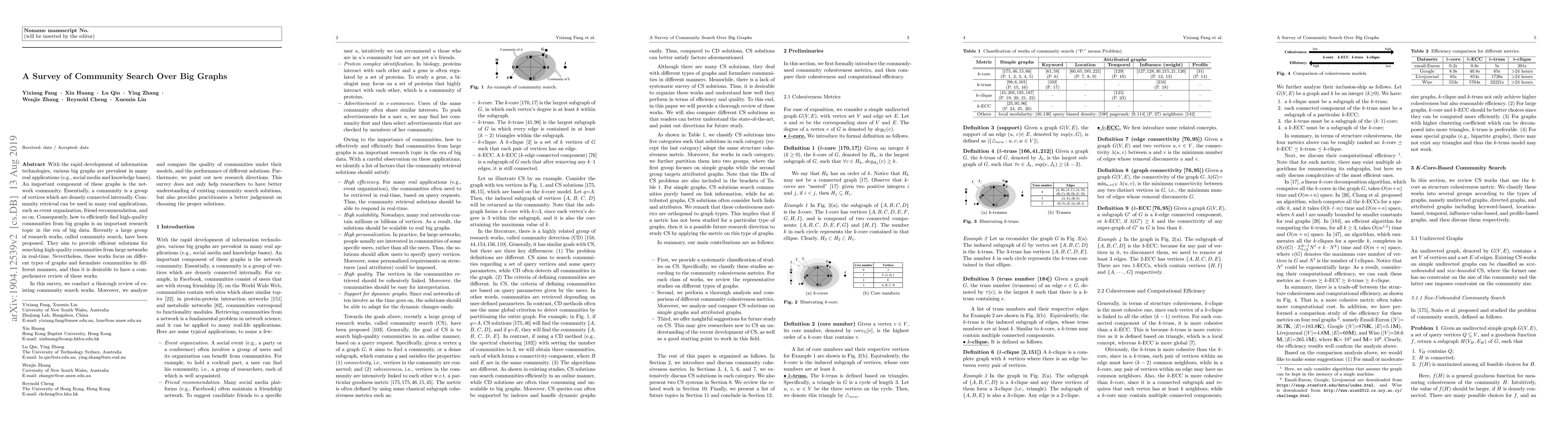 This paper surveys community search methods for large graphs, reviewing various approaches to efficiently retrieve high-quality communities. It analyzes the quality and performance of these methods and identifies new research directions to guide future work.