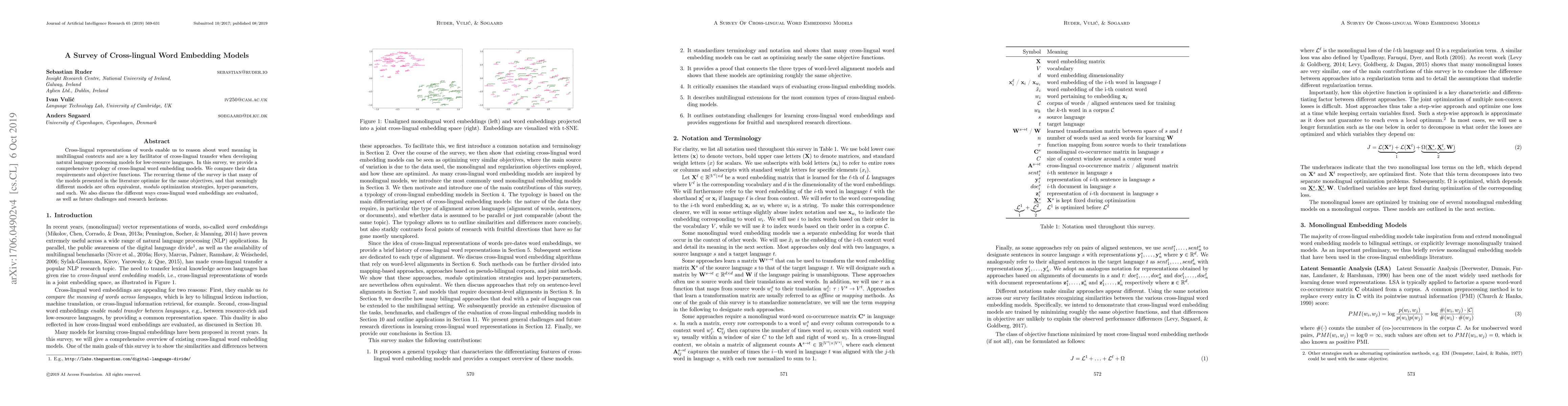 This paper surveys cross-lingual word embedding models, categorizing them based on data requirements and objectives, and highlights their equivalence under different optimization strategies. It also discusses evaluation methods and future research directions in this field.