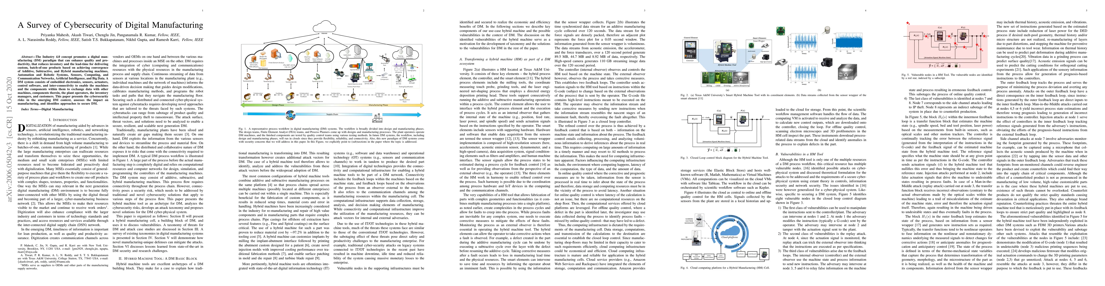 The Industry 4.0 concept promotes a digital manufacturing (DM) paradigm that can enhance quality and productivity, that reduces inventory and the lead-time for delivering custom, batch-of-one products based on achieving convergence of Additive, Subtractive, and Hybrid manufacturing machines, Automation and Robotic Systems, Sensors, Computing, and Communication Networks, Artificial Intelligence, and Big Data. A DM system consists of embedded electronics, sensors, actuators, control software, and inter-connectivity to enable the machines and the components within them to exchange data with other machines, components therein, the plant operators, the inventory managers, and customers. This paper presents the cybersecurity risks in the emerging DM context, assesses the impact on manufacturing, and identifies approaches to secure DM.