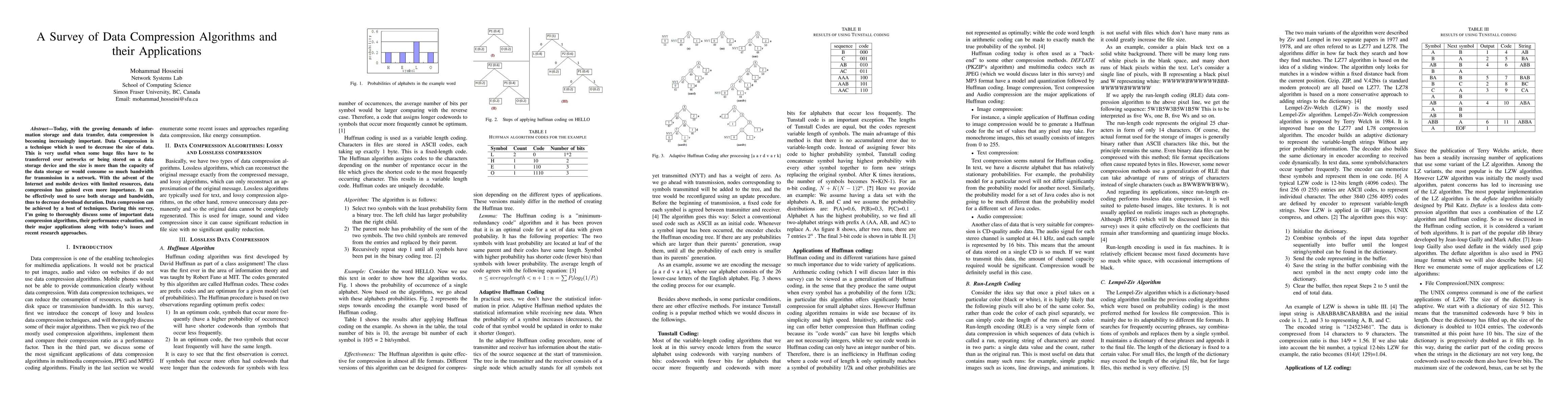 This paper surveys data compression algorithms and their applications, highlighting their importance in reducing storage and bandwidth consumption. It discusses various techniques and recent research approaches to improve data compression performance and efficiency.