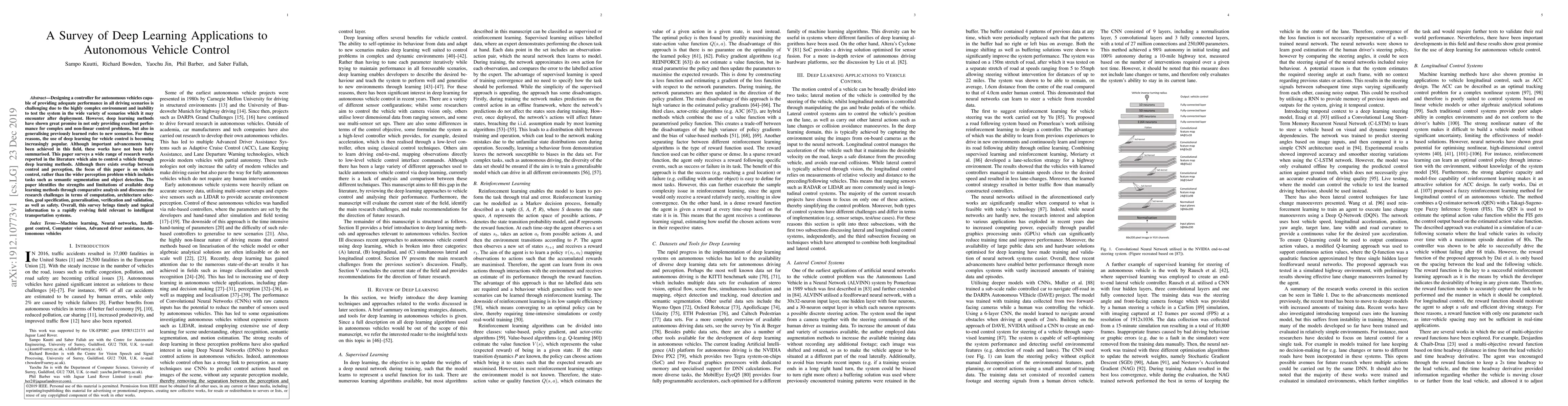This paper surveys deep learning applications in autonomous vehicle control, highlighting the strengths and limitations of various methods. It discusses challenges like computation, architecture selection, and safety, providing a comprehensive overview of current research in this rapidly evolving field.