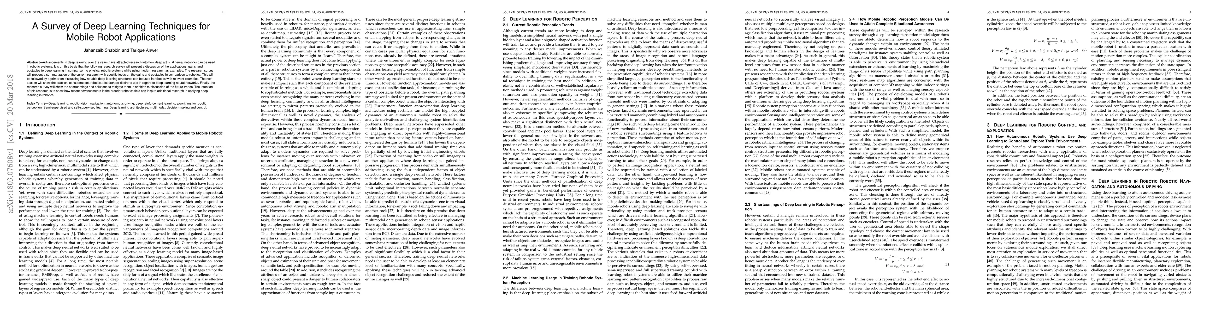 This survey examines how deep learning techniques improve mobile robot navigation, obstacle avoidance, and control, while highlighting challenges in deployment and energy efficiency. It provides a comprehensive overview of current research in applying deep learning to mobile robotics applications.