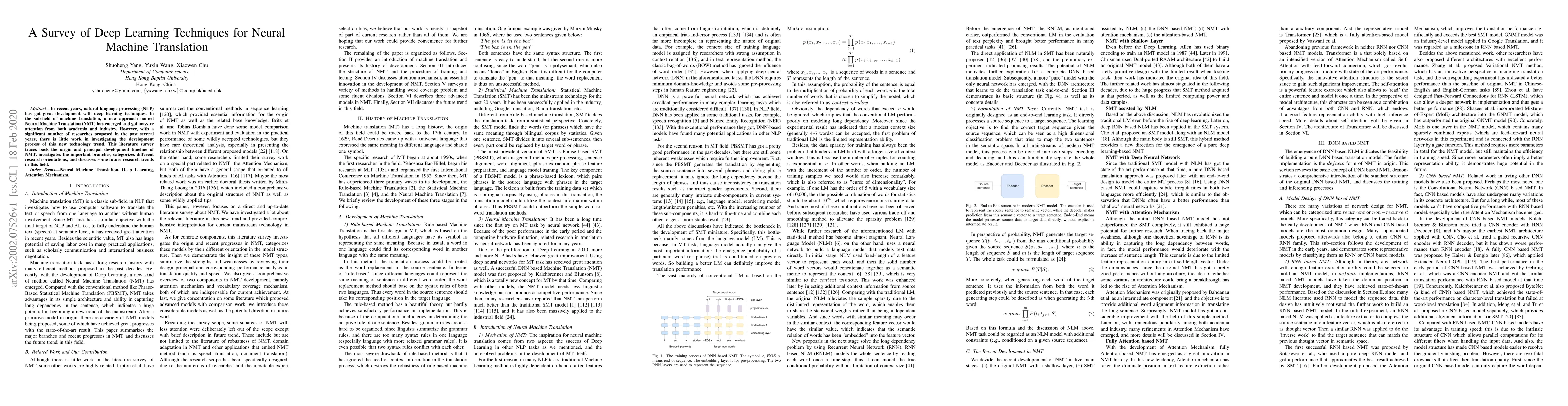 In recent years, natural language processing (NLP) has got great development with deep learning techniques. In the sub-field of machine translation, a new approach named Neural Machine Translation (NMT) has emerged and got massive attention from both academia and industry. However, with a significant number of researches proposed in the past several years, there is little work in investigating the development process of this new technology trend. This literature survey traces back the origin and principal development timeline of NMT, investigates the important branches, categorizes different research orientations, and discusses some future research trends in this field.