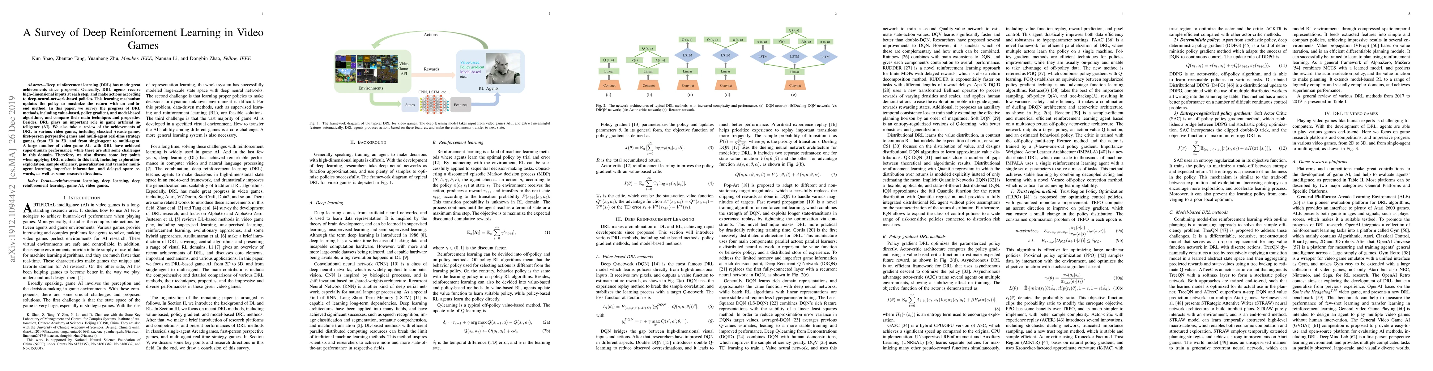 This paper surveys the advancements in deep reinforcement learning (DRL) techniques, comparing value-based, policy gradient, and model-based algorithms. It highlights DRL's significant role in video game AI, reviewing achievements in various game types and discussing challenges like exploration-exploitation and sample efficiency.