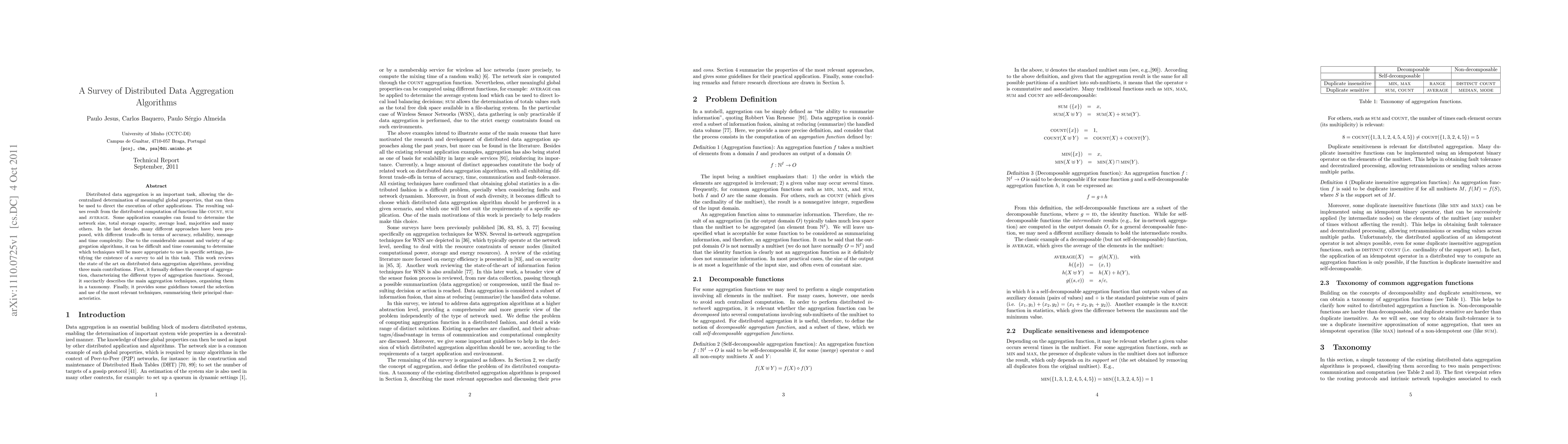 A survey of distributed data aggregation algorithms reviews existing techniques, defining types of aggregation functions, organizing them in a taxonomy, and providing guidelines for selecting the most relevant methods. The study aims to aid in choosing suitable aggregation techniques for specific settings.