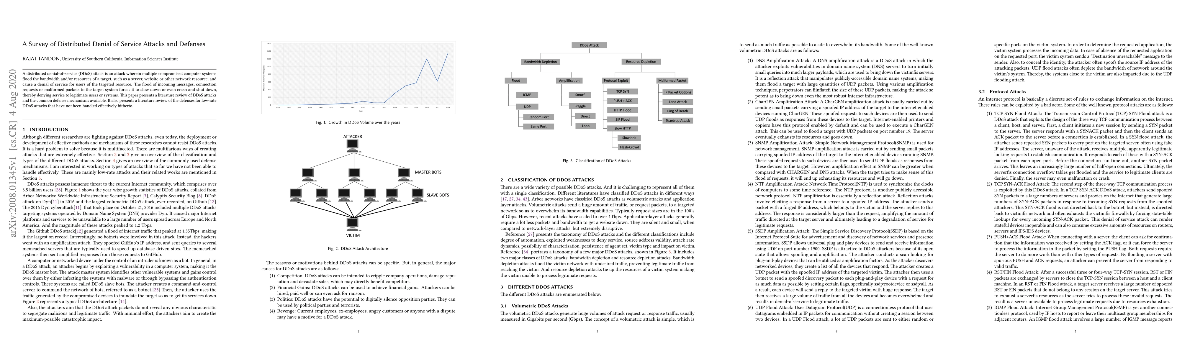 This paper reviews DDoS attacks, which flood targets with traffic to disrupt services, and surveys common defense strategies, focusing on defenses for low-rate DDoS attacks that remain inadequately addressed.