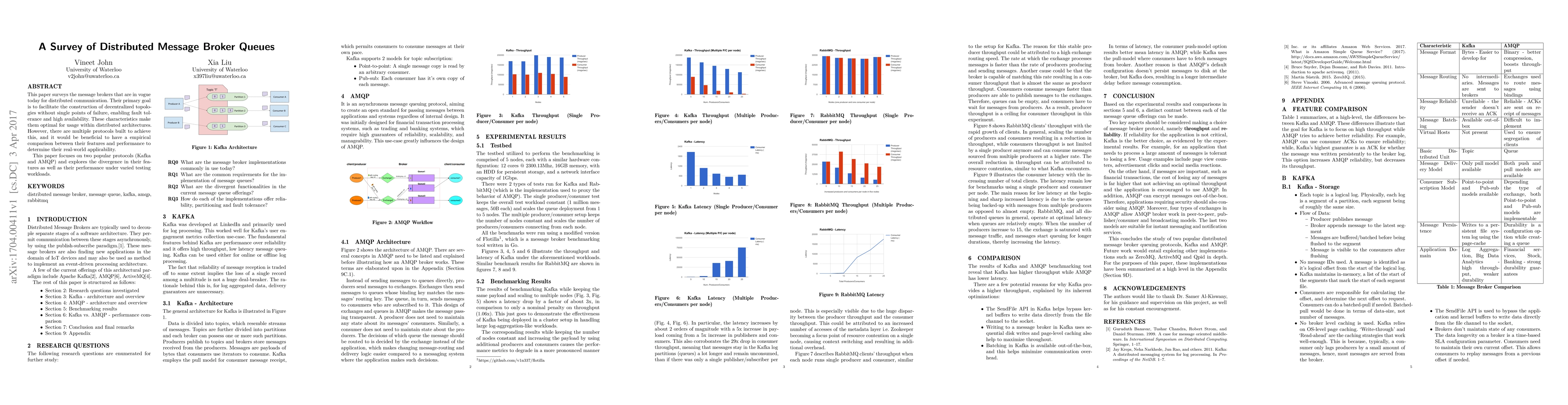 This paper surveys the message brokers that are in vogue today for distributed communication. Their primary goal is to facilitate the construction of decentralized topologies without single points of failure, enabling fault tolerance and high availability. These characteristics make them optimal for usage within distributed architectures. However, there are multiple protocols built to achieve this, and it would be beneficial to have a empirical comparison between their features and performance to determine their real-world applicability. This paper focuses on two popular protocols (Kafka and AMQP) and explores the divergence in their features as well as their performance under varied testing workloads.