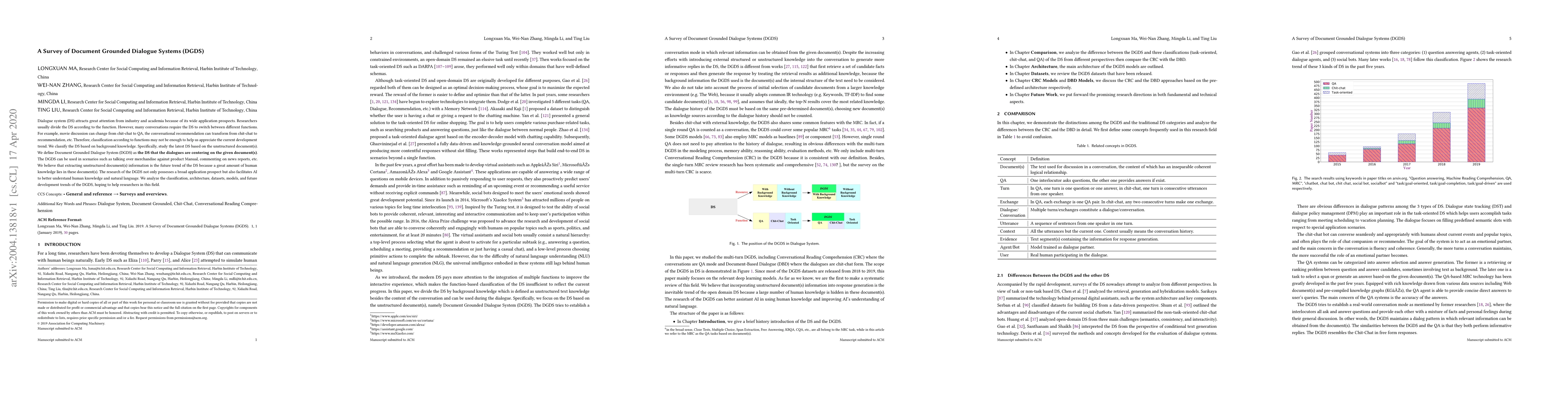 Dialogue system (DS) attracts great attention from industry and academia because of its wide application prospects. Researchers usually divide the DS according to the function. However, many conversations require the DS to switch between different functions. For example, movie discussion can change from chit-chat to QA, the conversational recommendation can transform from chit-chat to recommendation, etc. Therefore, classification according to functions may not be enough to help us appreciate the current development trend. We classify the DS based on background knowledge. Specifically, study the latest DS based on the unstructured document(s). We define Document Grounded Dialogue System (DGDS) as the DS that the dialogues are centering on the given document(s). The DGDS can be used in scenarios such as talking over merchandise against product Manual, commenting on news reports, etc. We believe that extracting unstructured document(s) information is the future trend of the DS because a great amount of human knowledge lies in these document(s). The research of the DGDS not only possesses a broad application prospect but also facilitates AI to better understand human knowledge and natural language. We analyze the classification, architecture, datasets, models, and future development trends of the DGDS, hoping to help researchers in this field.