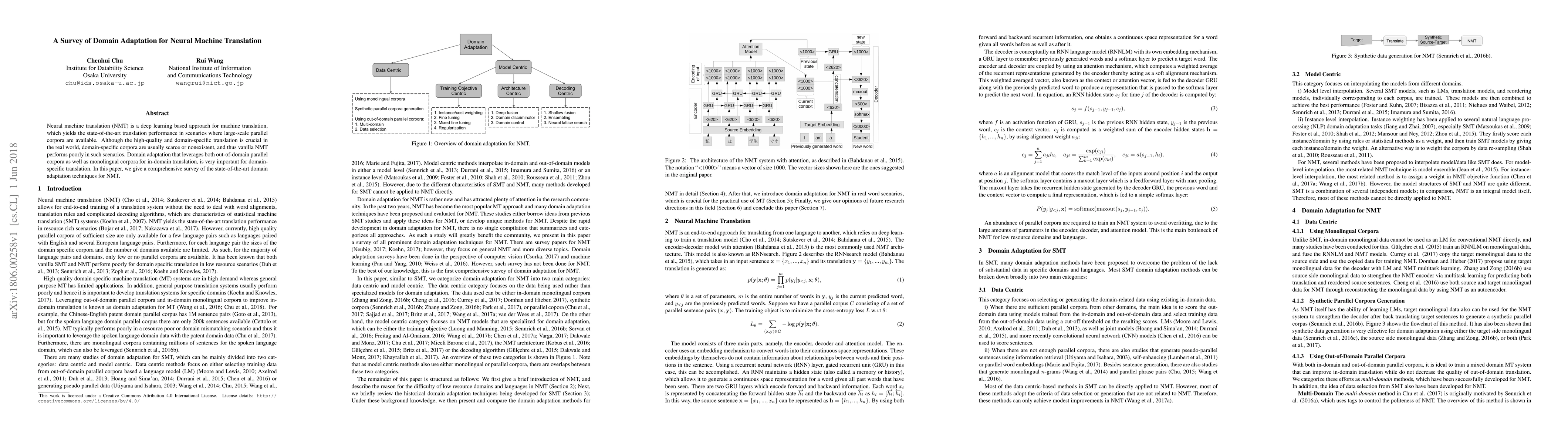 This paper provides a comprehensive survey of advanced domain adaptation techniques for neural machine translation (NMT), focusing on methods that utilize both out-of-domain parallel corpora and monolingual data to improve translation performance in domain-specific scenarios where parallel corpora are scarce.