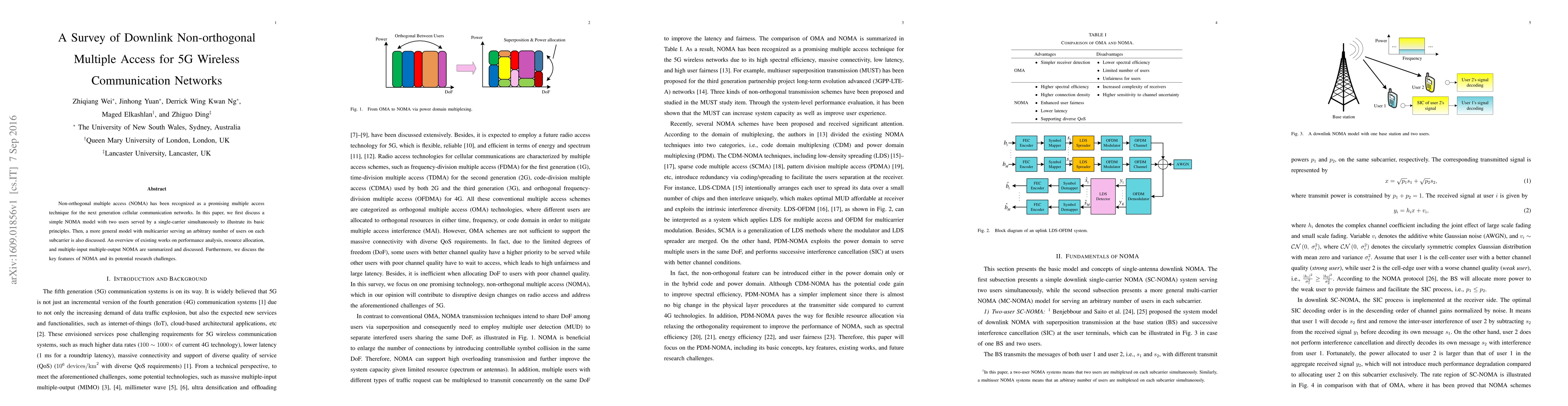 This paper surveys non-orthogonal multiple access (NOMA) for 5G networks, detailing basic and multicarrier NOMA models, and summarizing performance analysis, resource allocation, and MIMO NOMA studies. It also highlights NOMA's key features and potential research challenges.