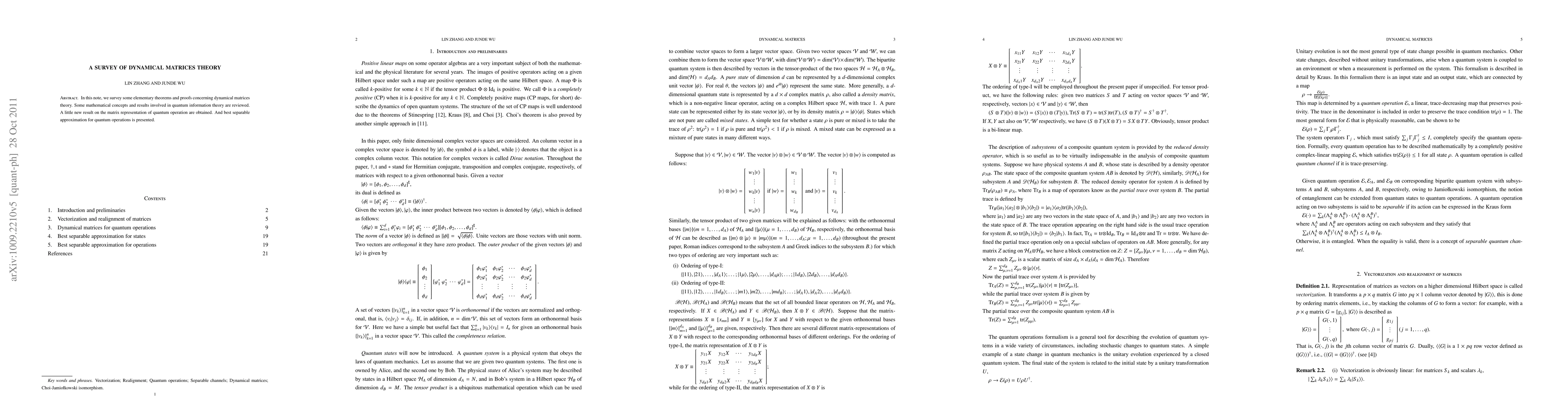 This paper surveys key concepts and results in dynamical matrices theory, including a new result on quantum operation representation and best separable approximation for quantum operations.