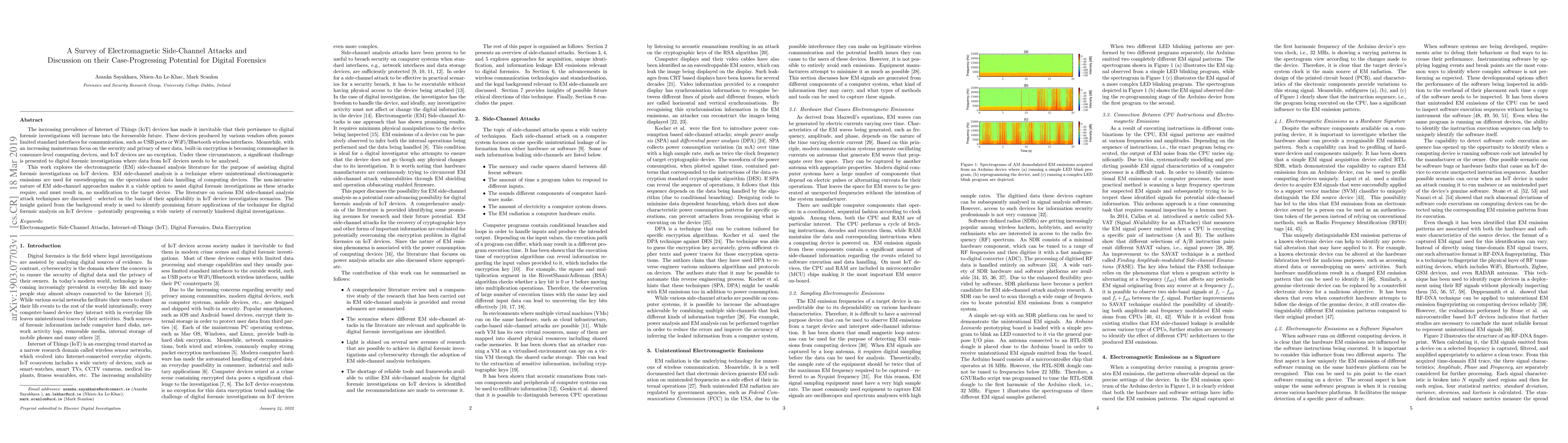 This paper explores electromagnetic side-channel analysis for digital forensic investigations on IoT devices, identifying promising future applications to aid in non-intrusive data analysis.