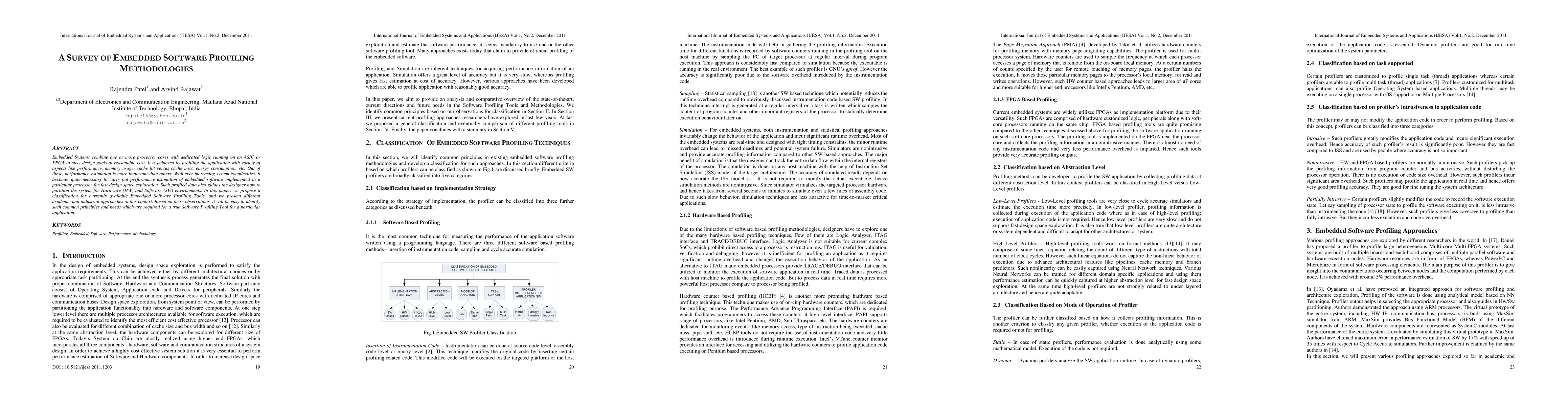 This paper surveys embedded software profiling methodologies, classifying existing tools and presenting various academic and industrial approaches to performance estimation, memory usage, and energy consumption in embedded systems. The aim is to identify common principles and needs for effective software profiling in complex embedded environments.