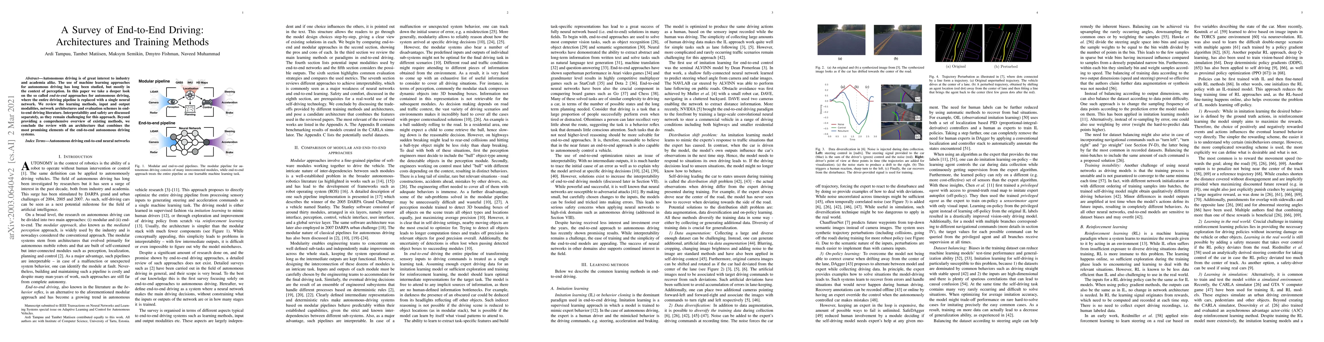 This paper surveys end-to-end autonomous driving approaches, reviewing neural network architectures, training methods, and evaluation schemes. It highlights the challenges of interpretability and safety while proposing a combined architecture that integrates the most promising elements from existing systems.