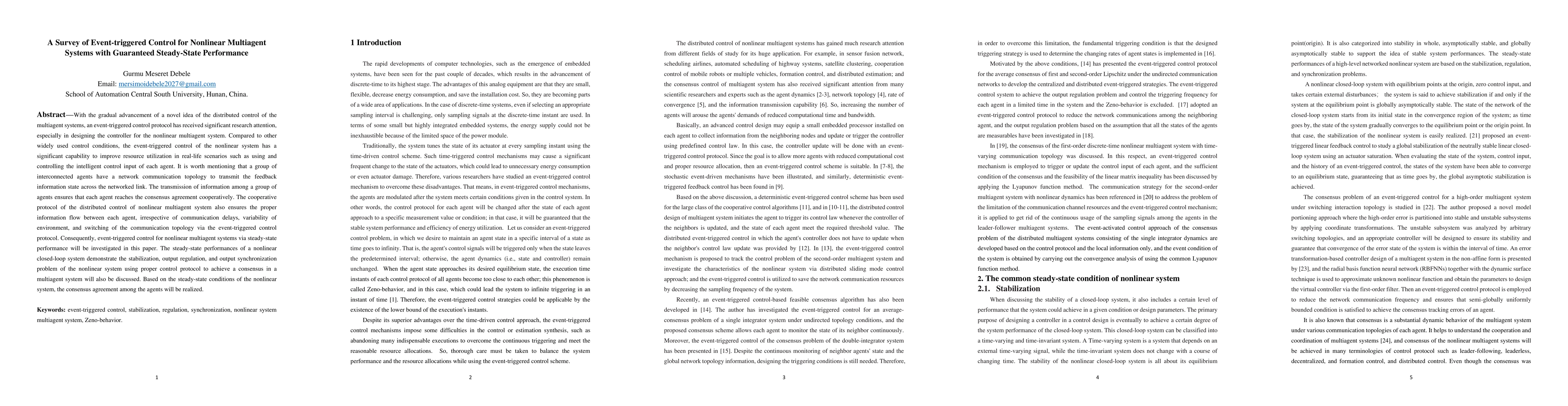 With the gradual advancement of a novel idea of the distributed control of the multiagent systems, an event-triggered control protocol has received significant research attention, especially in designing the controller for the nonlinear multiagent system. Compared to other widely used control conditions, the event-triggered control of the nonlinear system has a significant capability to improve resource utilization in real-life scenarios such as using and controlling the intelligent control input of each agent. It is worth mentioning that a group of interconnected agents have a network communication topology to transmit the feedback information state across the networked link. The transmission of information among a group of agents ensures that each agent reaches the consensus agreement cooperatively. The cooperative protocol of the distributed control of nonlinear multiagent system also ensures the proper information flow between each agent, irrespective of communication delays, variability of environment, and switching of the communication topology via the event-triggered control protocol. Consequently, event-triggered control for nonlinear multi-agent systems via steady-state performance will be investigated in this paper. The steady-state performances of a nonlinear closed-loop system demonstrate the stabilization, output regulation, and output synchronization problem of the nonlinear system using proper control protocol to achieve a consensus in a multiagent system will also be discussed. Based on the steady-state conditions of the nonlinear system, the consensus agreement among the agents will be realized.