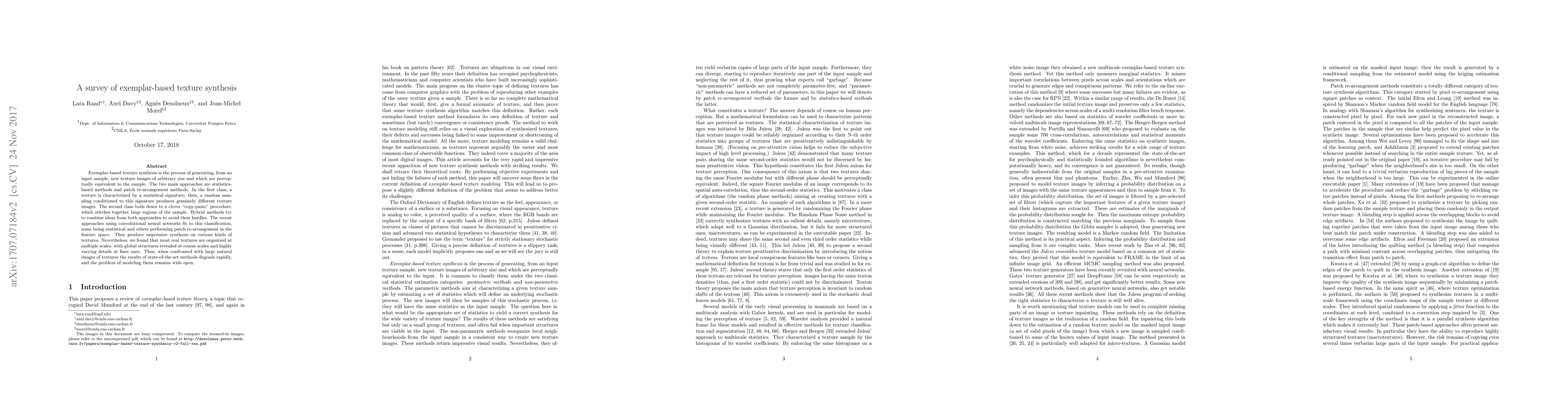 This paper surveys exemplar-based texture synthesis methods, categorizing them into statistics-based and patch re-arrangement approaches, and discusses the limitations of current techniques in handling multi-scale natural textures. Recent neural network-based methods show promise but struggle with large, complex textures.